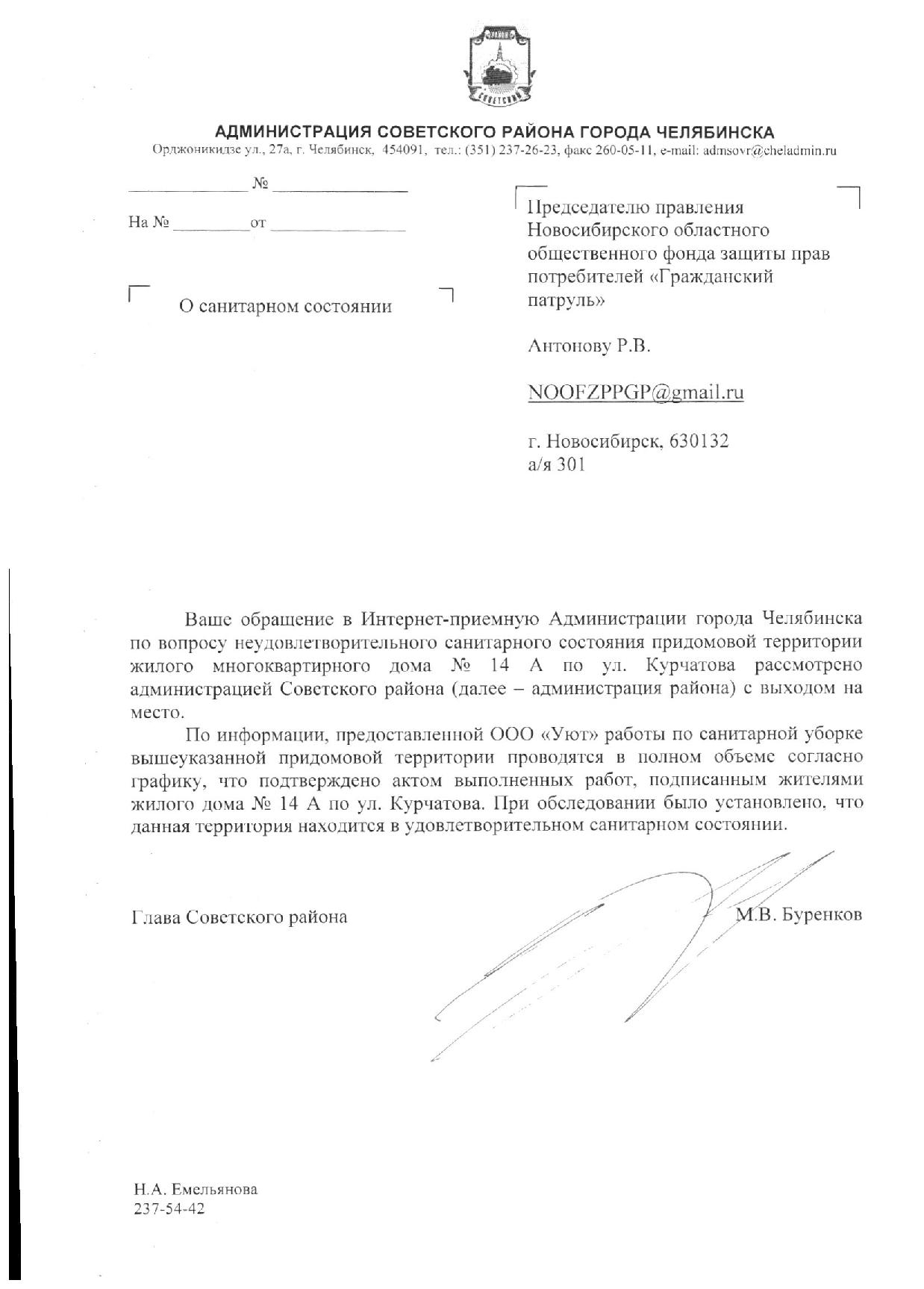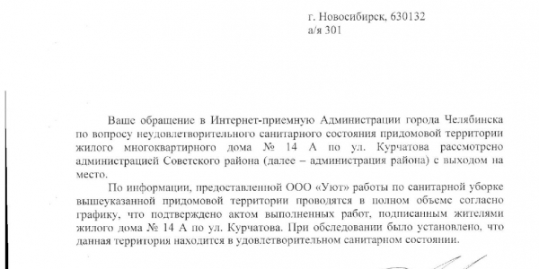 Номер жалобы:16929 Тип жалобы:Иные проблемы ЖКХ Название объекта:Администрация Челябинска Регион:Челябинская область Город:Челябинск Адрес:ул. Танкистов, 181 Описание жалобы:Не производится уборка навеса, покрывающий вход в парадную Статус: