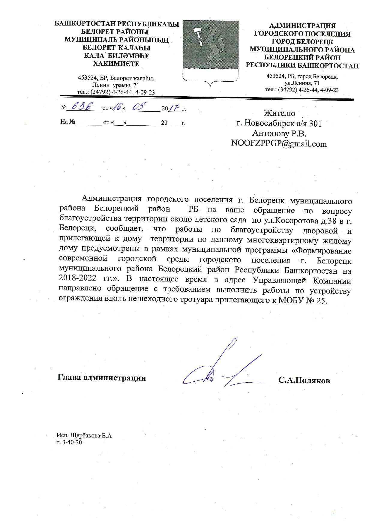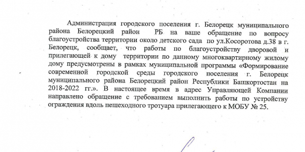 Номер жалобы:17255 Тип жалобы:Иные проблемы ЖКХ Название объекта:Администрация г. Белорецк Регион:Республика Башкортостан Город:Белорецк Адрес:ул. Косоротова, 38 Описание жалобы:Постоянно паркуют машины непосредственно под окнами жилого дома, на газоне, нередко перекрывая въезд в детский сад. Часто срабатывает сигнализация прямо под окнами по ночам. Статус:
