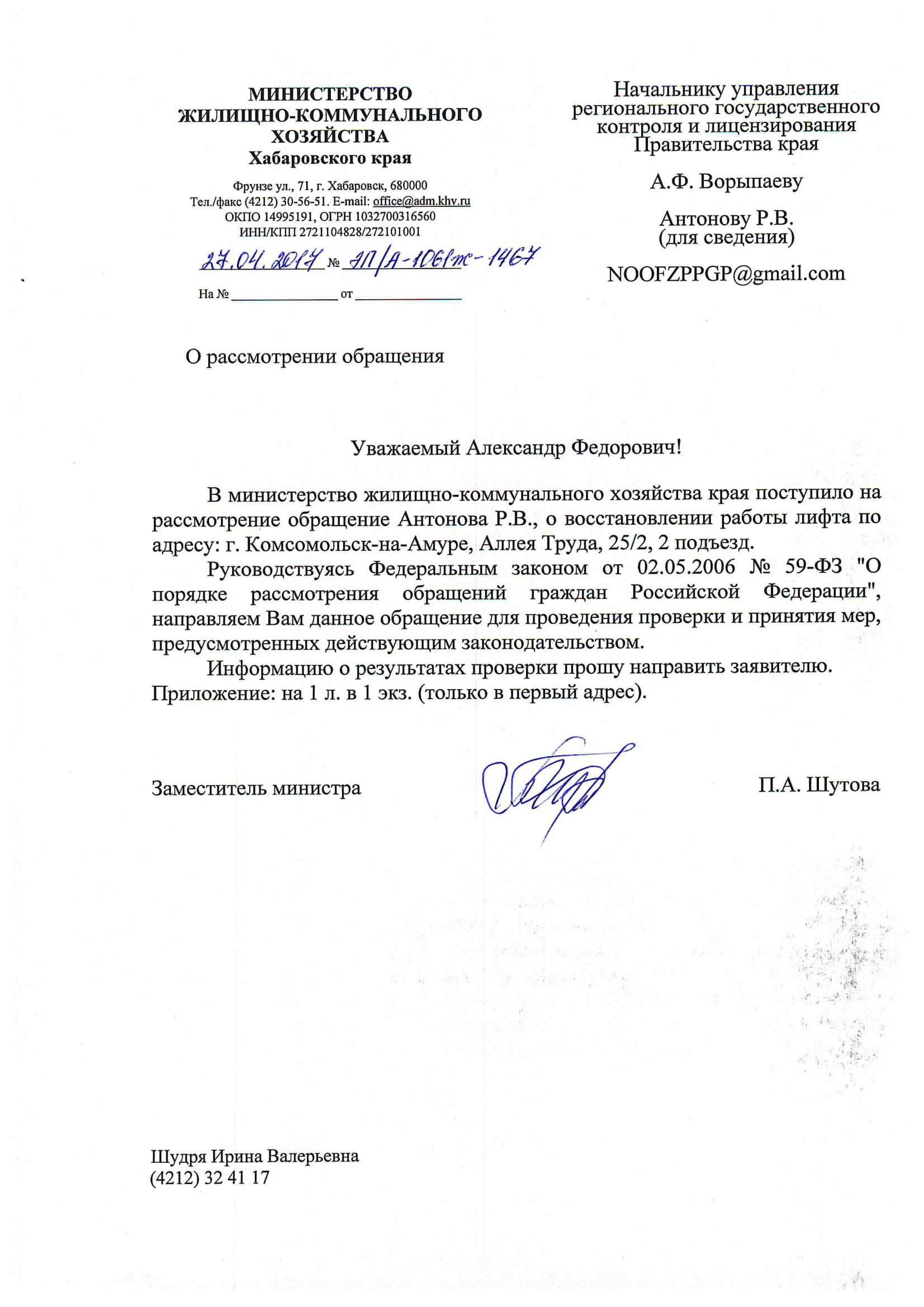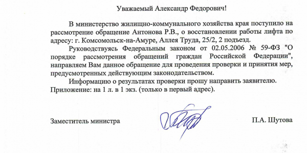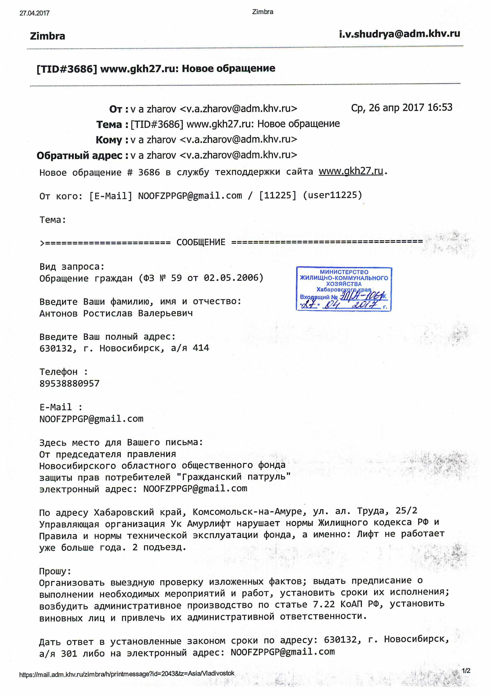 Номер жалобы:17064 Тип жалобы:Иные проблемы ЖКХ Название объекта:Ук Амурлифт Регион:Хабаровский край Город:Комсомольск-на-Амуре Адрес:ул. ал. Труда, 25/2 Описание жалобы:Лифт не работает уже больше года. 2 подъезд Статус: