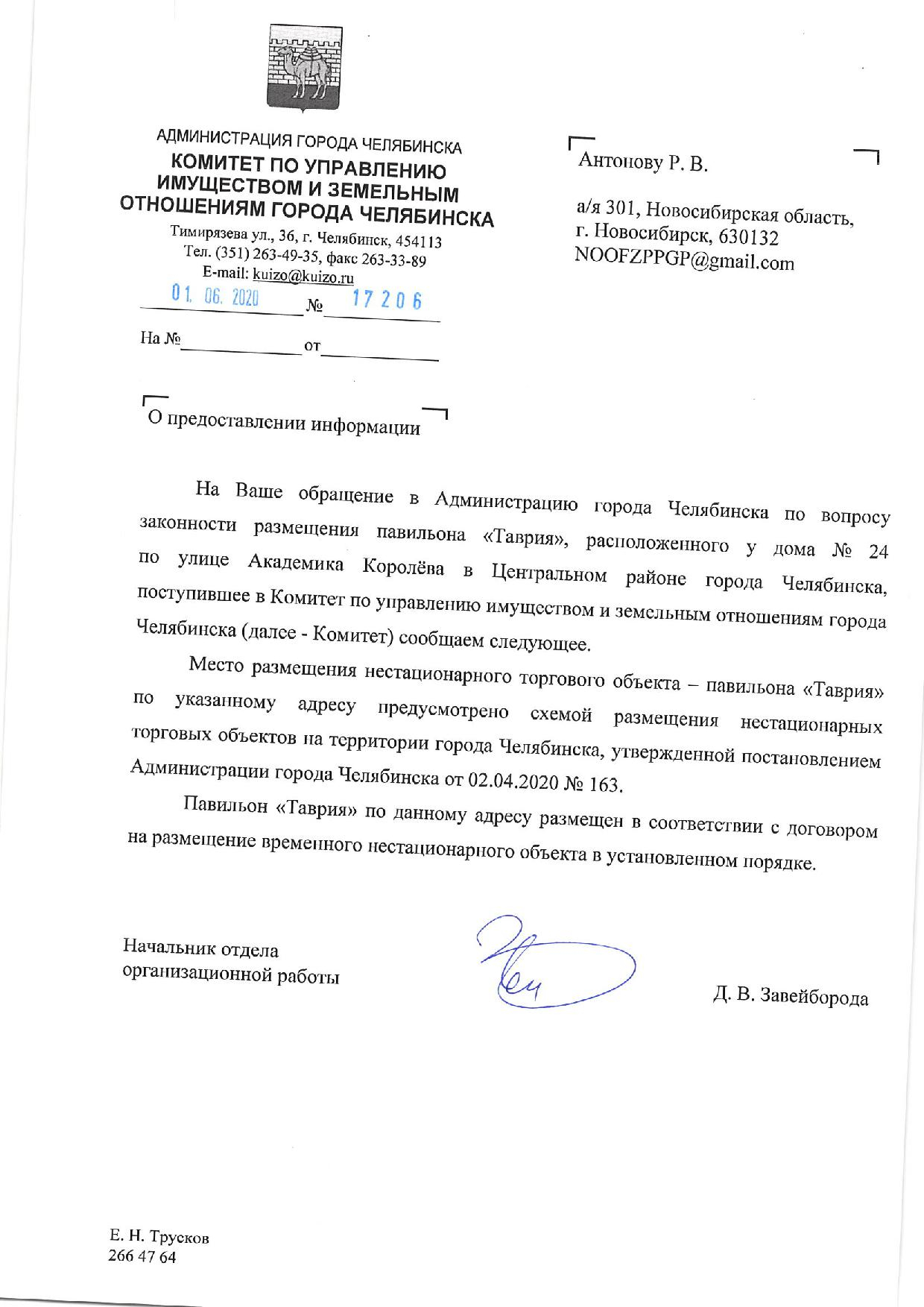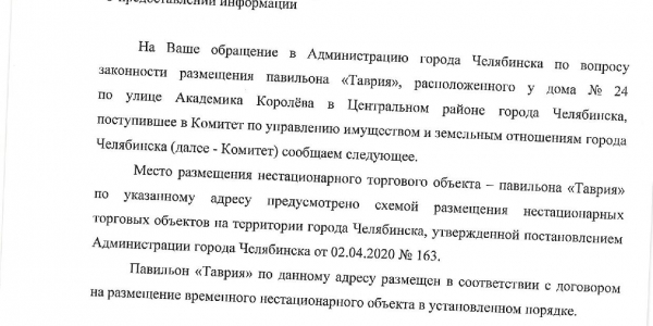Номер жалобы:65838 Тип жалобы:Прочее Название объекта:Администрация г.Челябинска Регион:Челябинская область Город:Челябинск Адрес:улица Академика Королёва, 24 Описание жалобы:Напротив дома 24 по ул.Ак.Королева установлен торговый павильон «Таврия» .