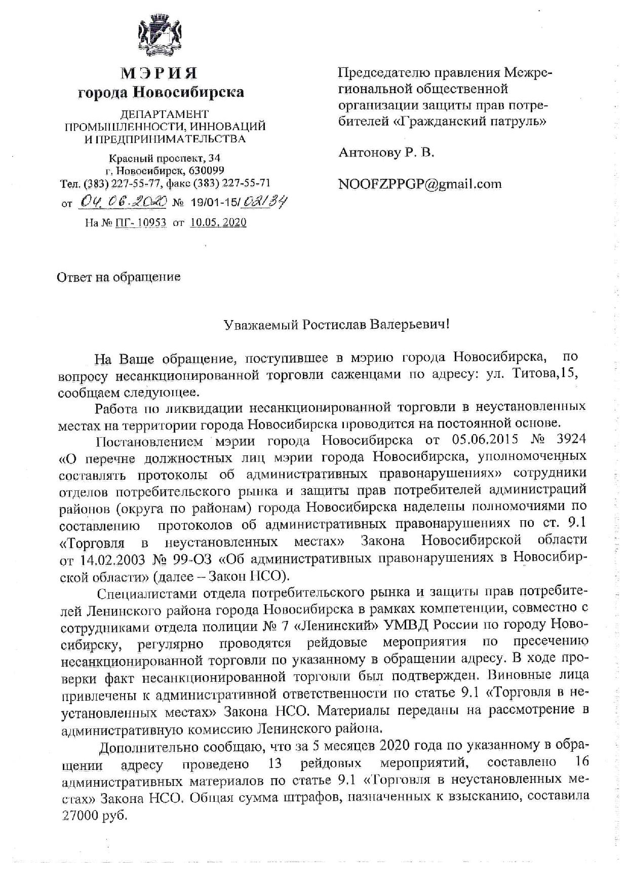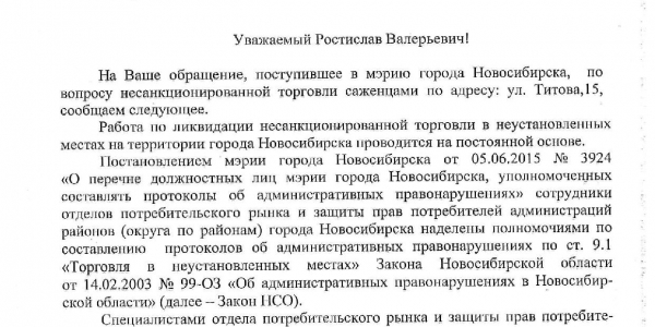 Номер жалобы:65864 Тип жалобы:Прочее Название объекта: Регион:Новосибирская область Город:Новосибирск Адрес:улица Титова, 15 Описание жалобы:Незаконная торговля саженцами растений Статус:
