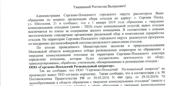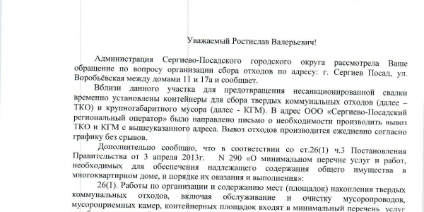 Просим исправить вышеуказанные нарушения и проработать размещение площадок накопления твердых коммунальных отходов в соответствии со статьей 13.4. Требования к местам (площадкам) накопления отходов Федерального закона от 24 июня 1998 года N 89-ФЗ "Об отходах производства и потребления" (с изменениями на 7 апреля 2020 года), а также ответить в письменном виде на следующие вопросы: