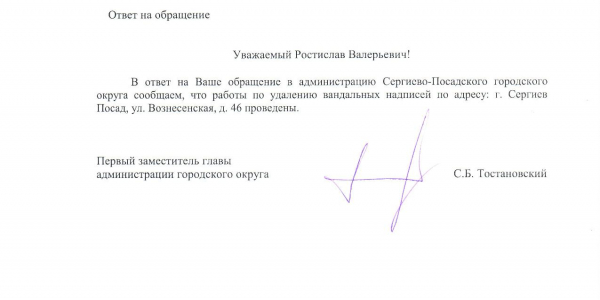 Номер жалобы:65888 Тип жалобы:Прочее Название объекта: Регион:Московская область Город:Сергиев Посад Адрес:Вознесенская улица, 46 Описание жалобы:Надписи на жалюзях окон первого этажа Статус: