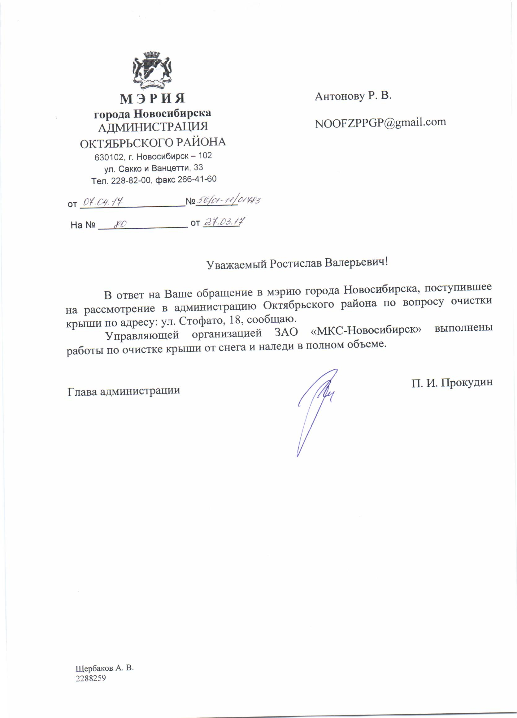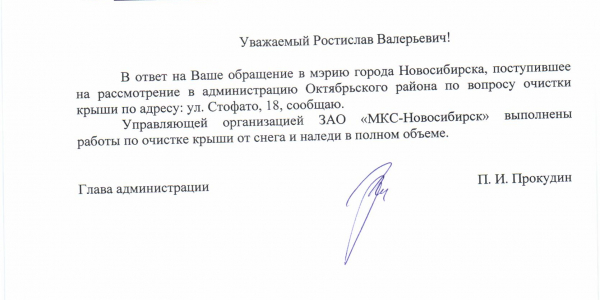 Номер жалобы:15915 Тип жалобы:Иные проблемы ЖКХ Название объекта:Управляющая Компания Город:Новосибирск Адрес:Новосибирск, улица Стофато, 19 Описание жалобы: Снег на крыше дома Статус: