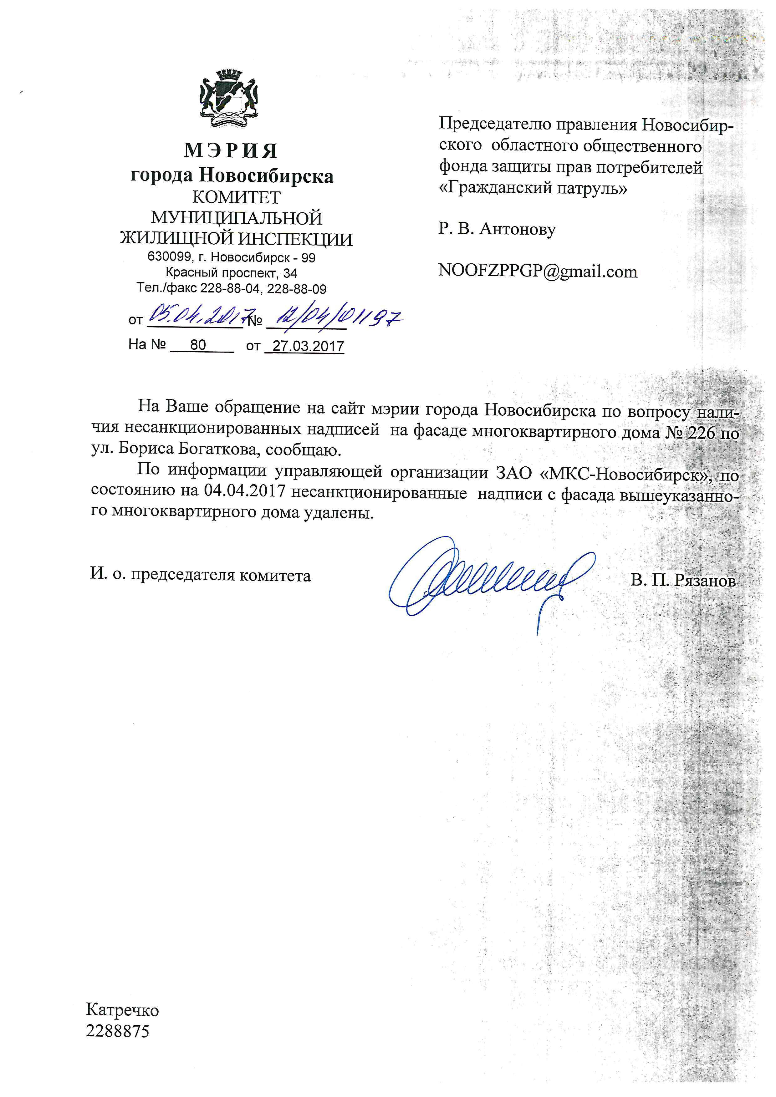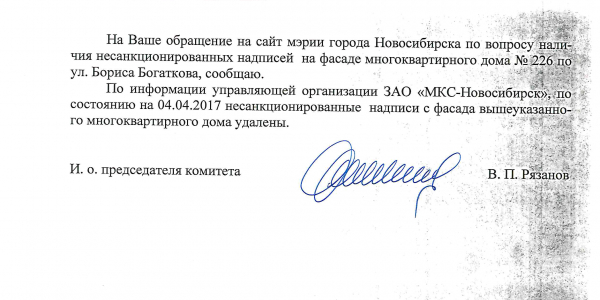 Номер жалобы:15919 Тип жалобы:Иные проблемы ЖКХ Название объекта:Управляющая Компания Город:Новосибирск Адрес:Новосибирск, улица Бориса Богаткова, 226 Описание жалобы:Надписи на фасаде дома Статус: