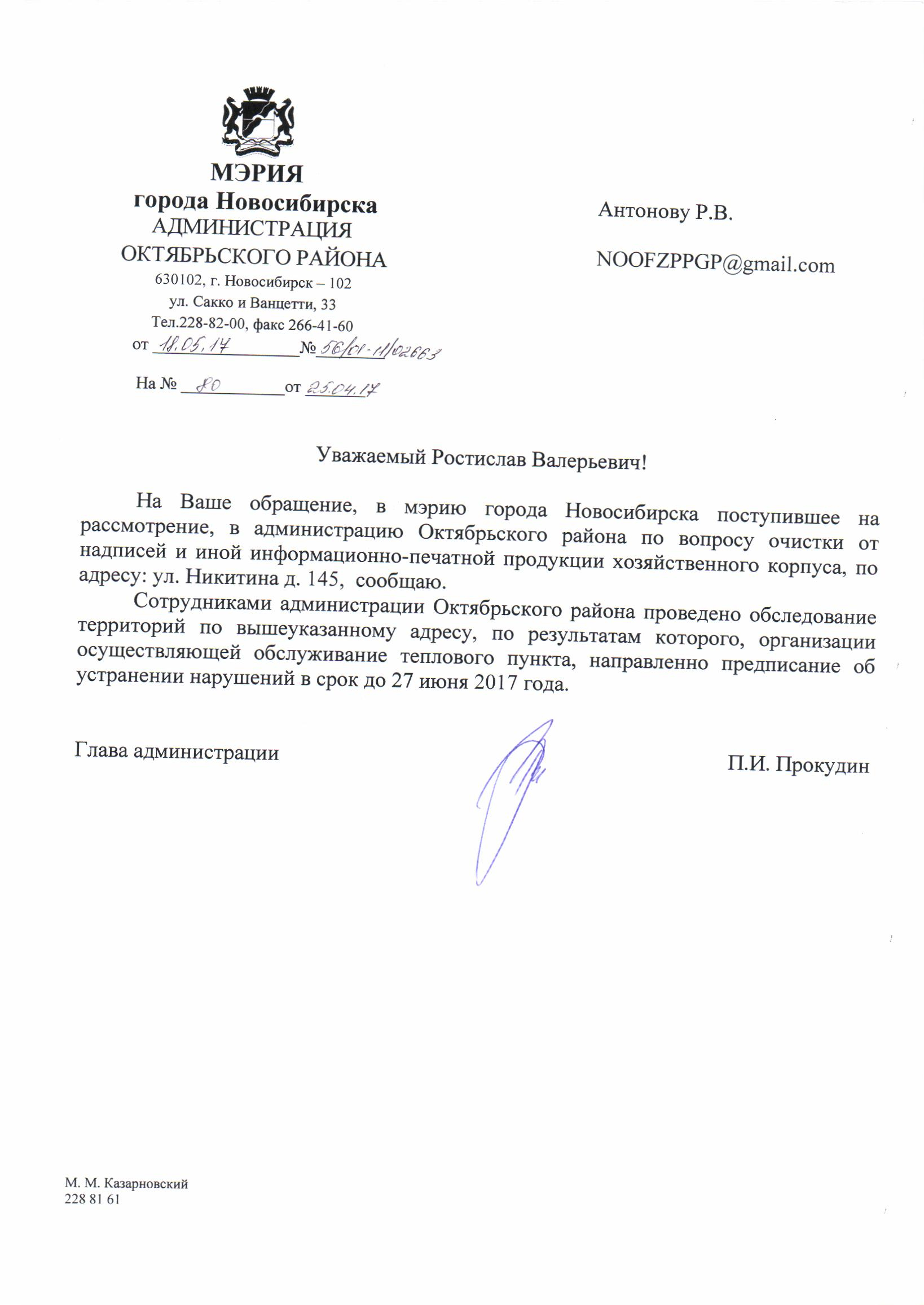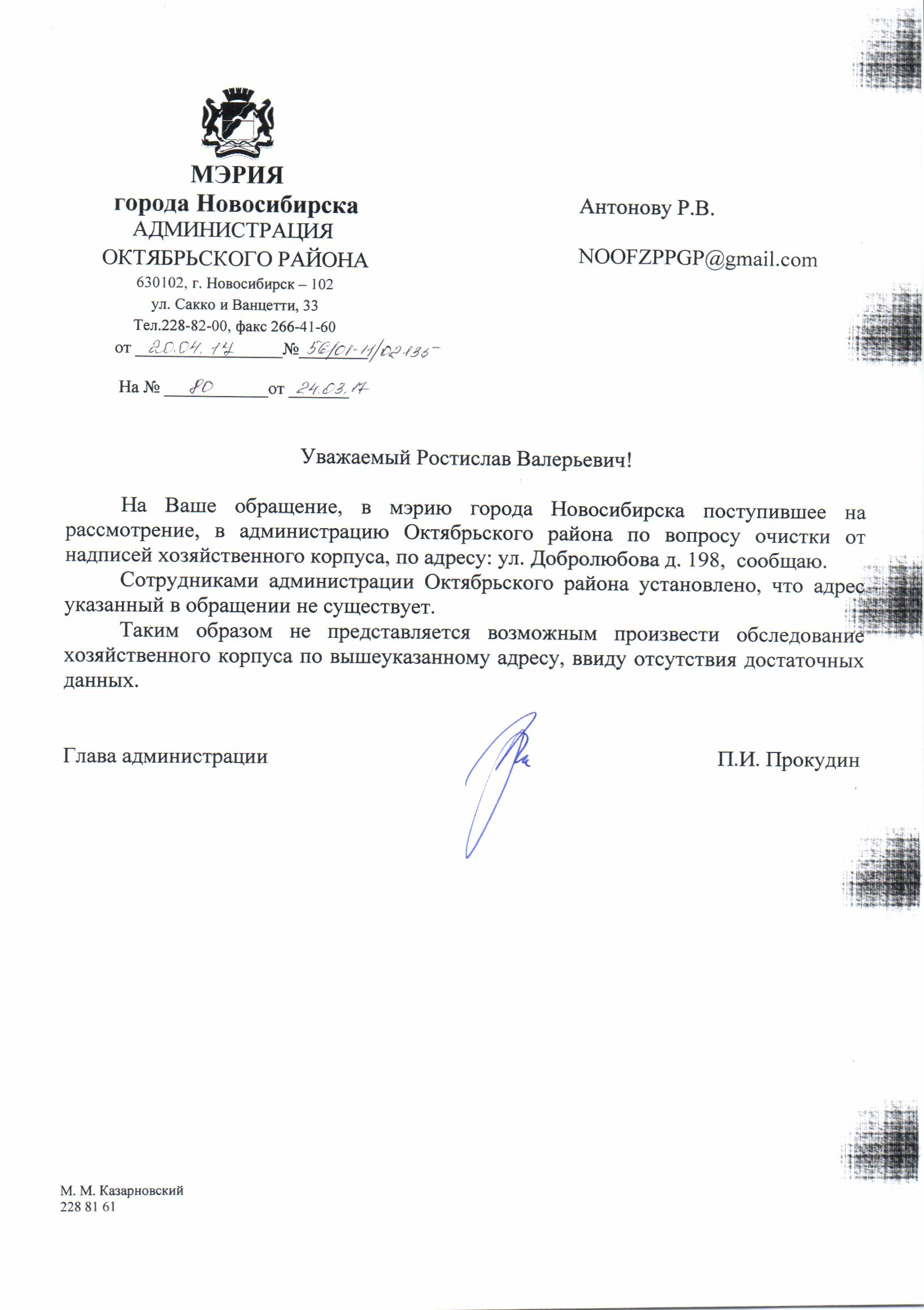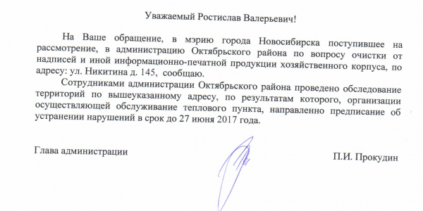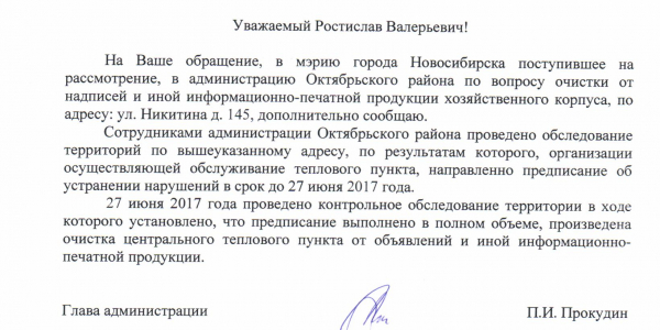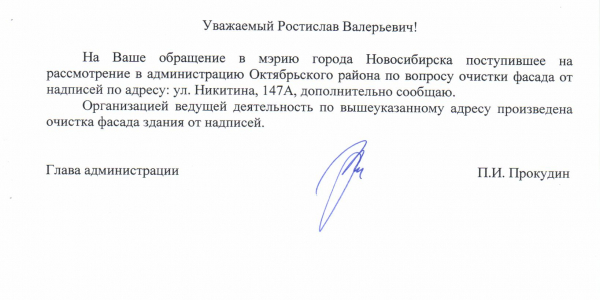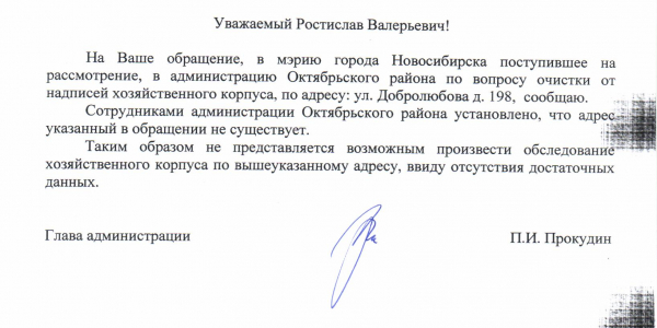 Номер жалобы:15871 Тип жалобы:Иные проблемы ЖКХ Название объекта:Управляющая Компания Регион:Новосибирская область Город:Новосибирск Адрес:улица Никитина, 145 Описание жалобы:Добролюбова 198 надписи на хозяйственном корпусе Статус: