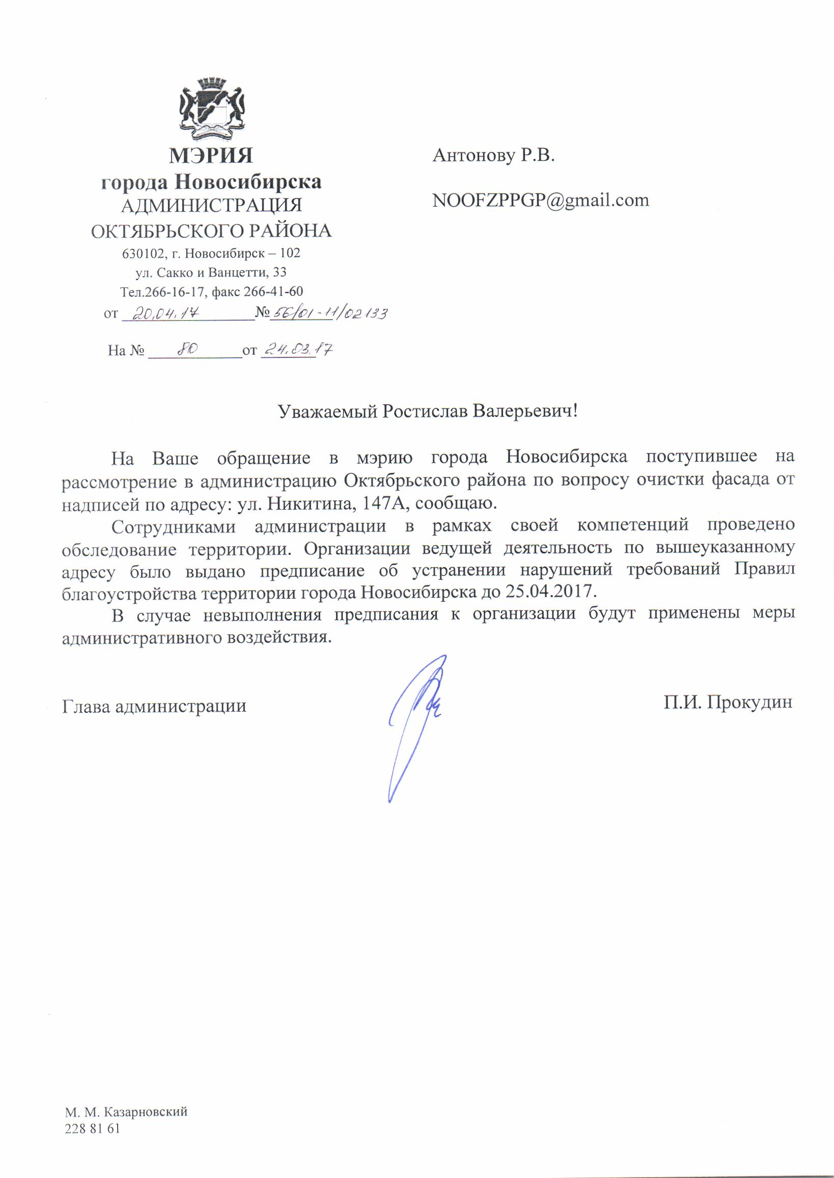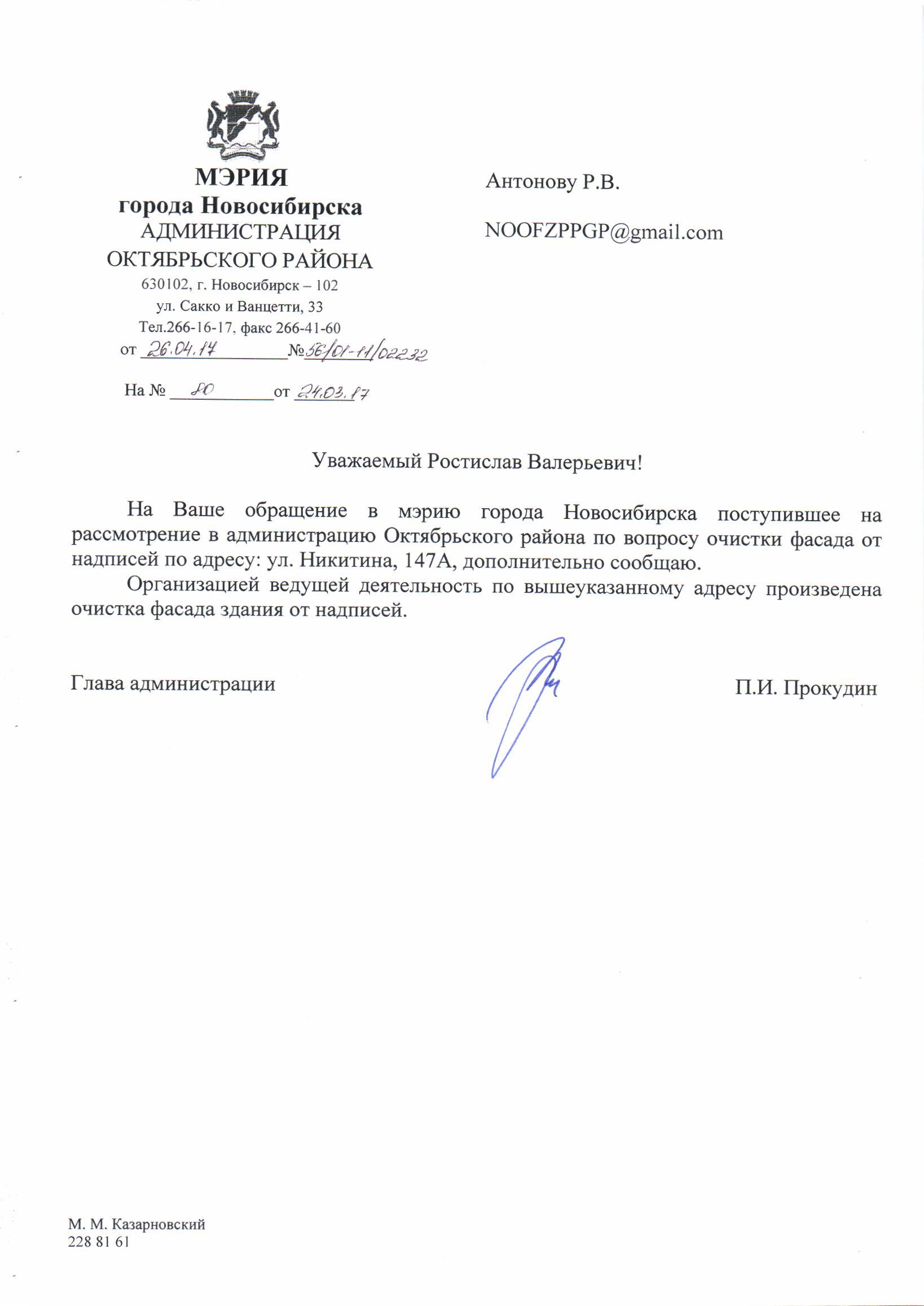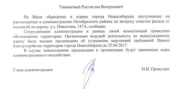 Номер жалобы:15875 Тип жалобы:Иные проблемы ЖКХ Название объекта:Управляющая Компания Город:Новосибирск Адрес:Новосибирск, улица Никитина, 147А Описание жалобы:Надписи на стенах Статус: