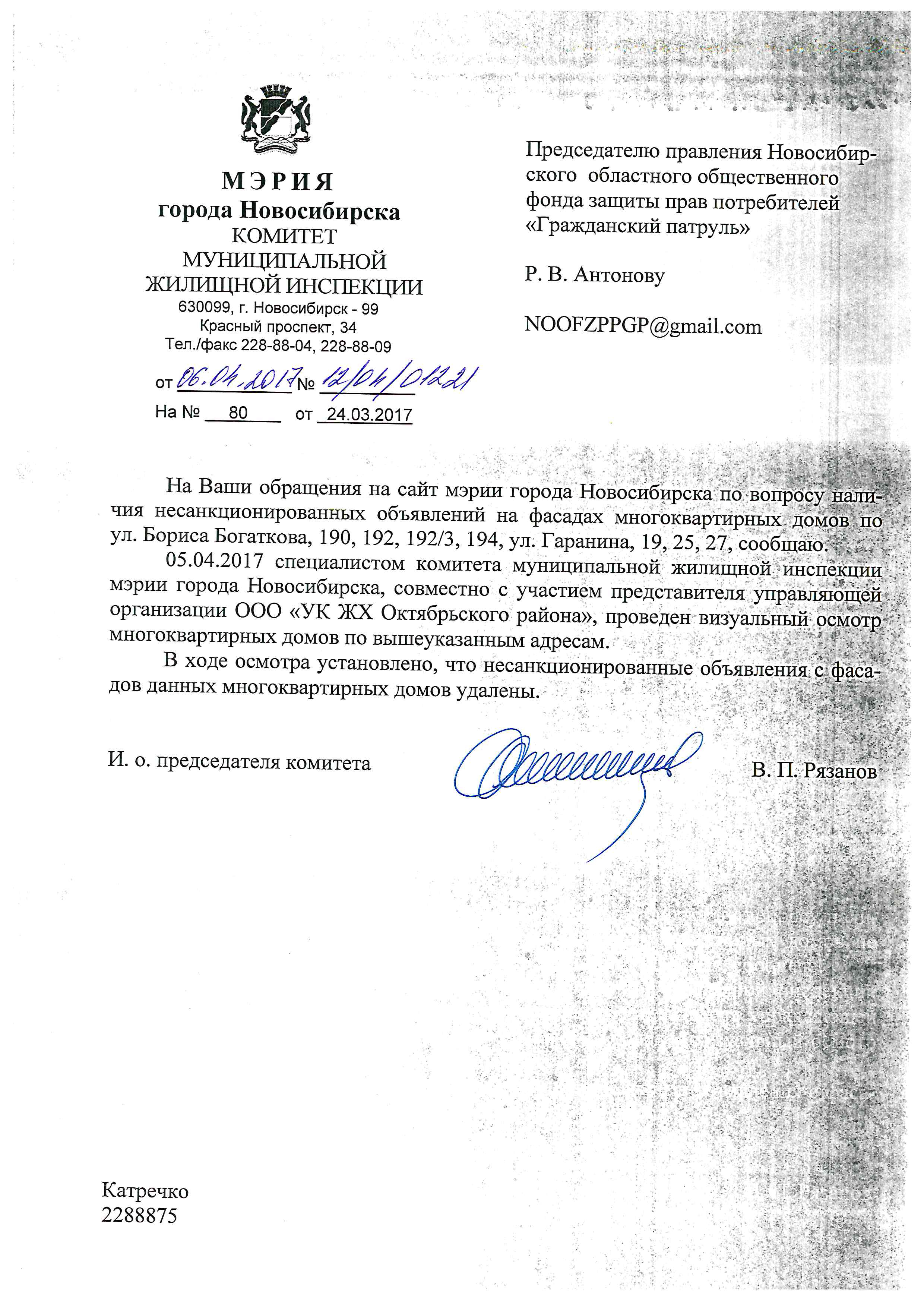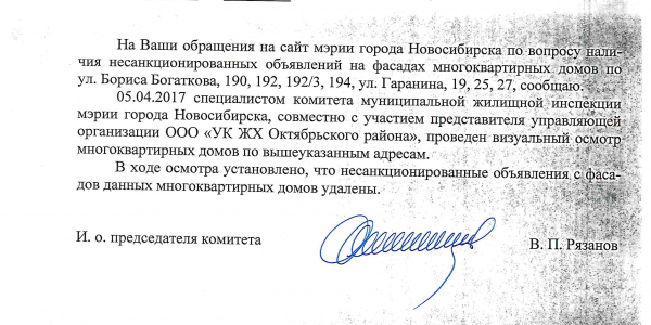 Номер жалобы:15830 Тип жалобы:Иные проблемы ЖКХ Название объекта:Управляющая Компания Город:Новосибирск Адрес:Новосибирск, улица Бориса Богаткова, 194 Описание жалобы:Объявления на хозяйственном корпусе Статус: