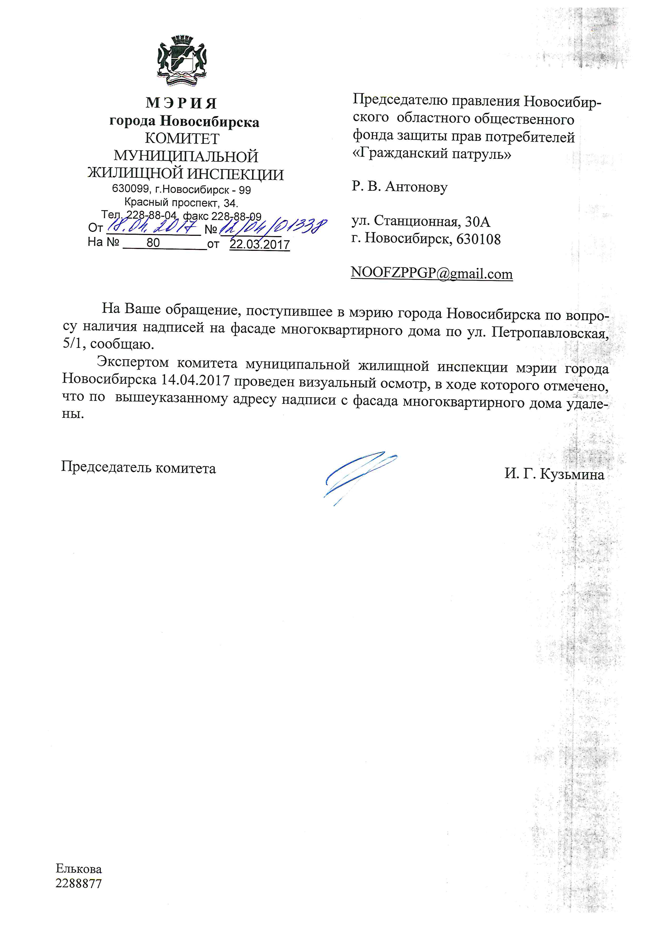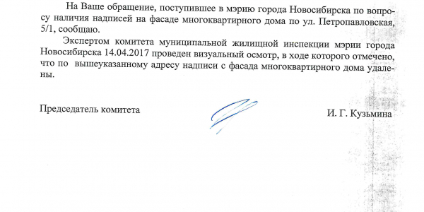 Номер жалобы:15701 Тип жалобы:Иные проблемы ЖКХ Название объекта:Управляющая Компания Город:Новосибирск Адрес:Новосибирск, 2-й Крашенинникова переулок, 14 Описание жалобы:Надписи на фасаде Статус:
