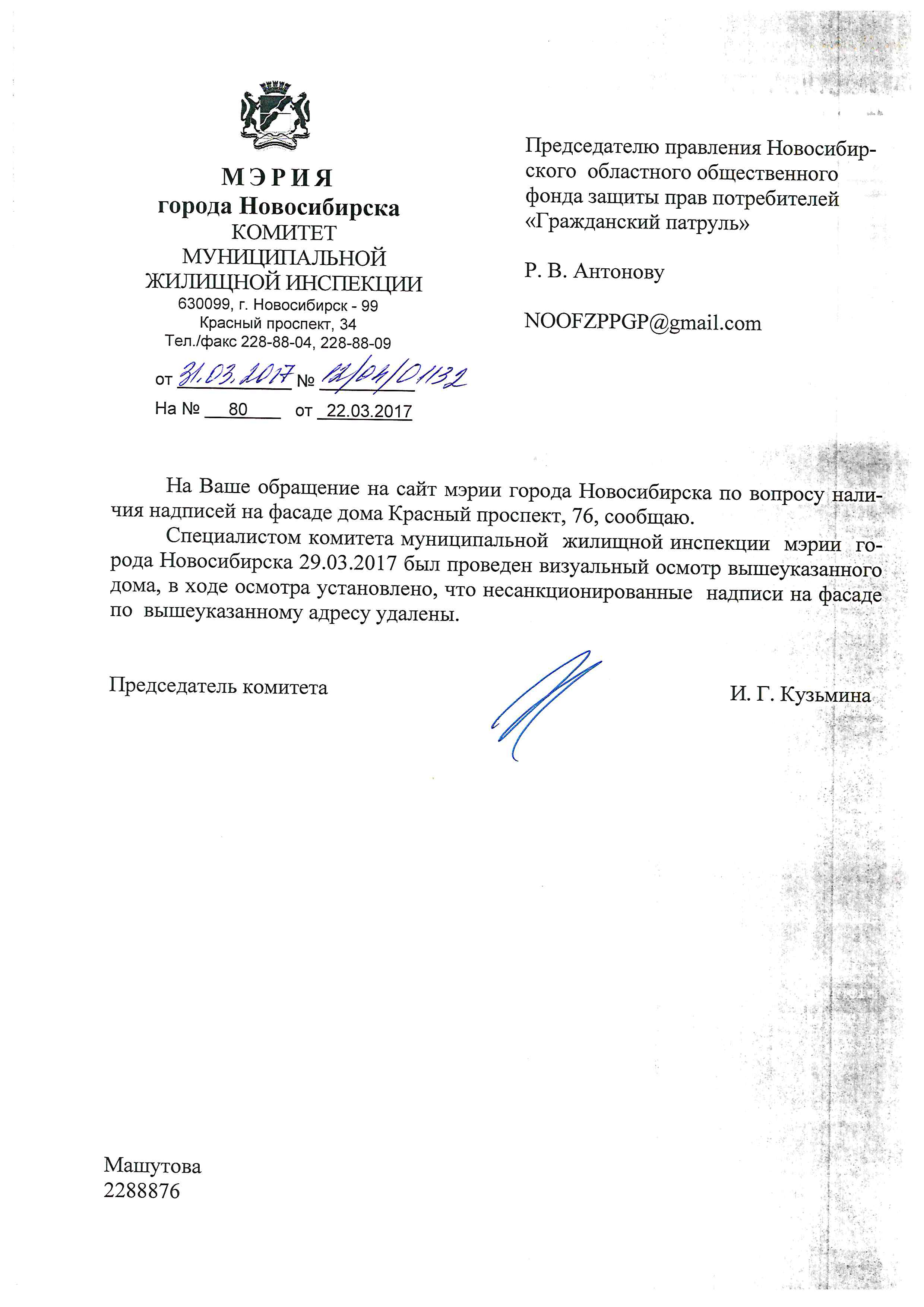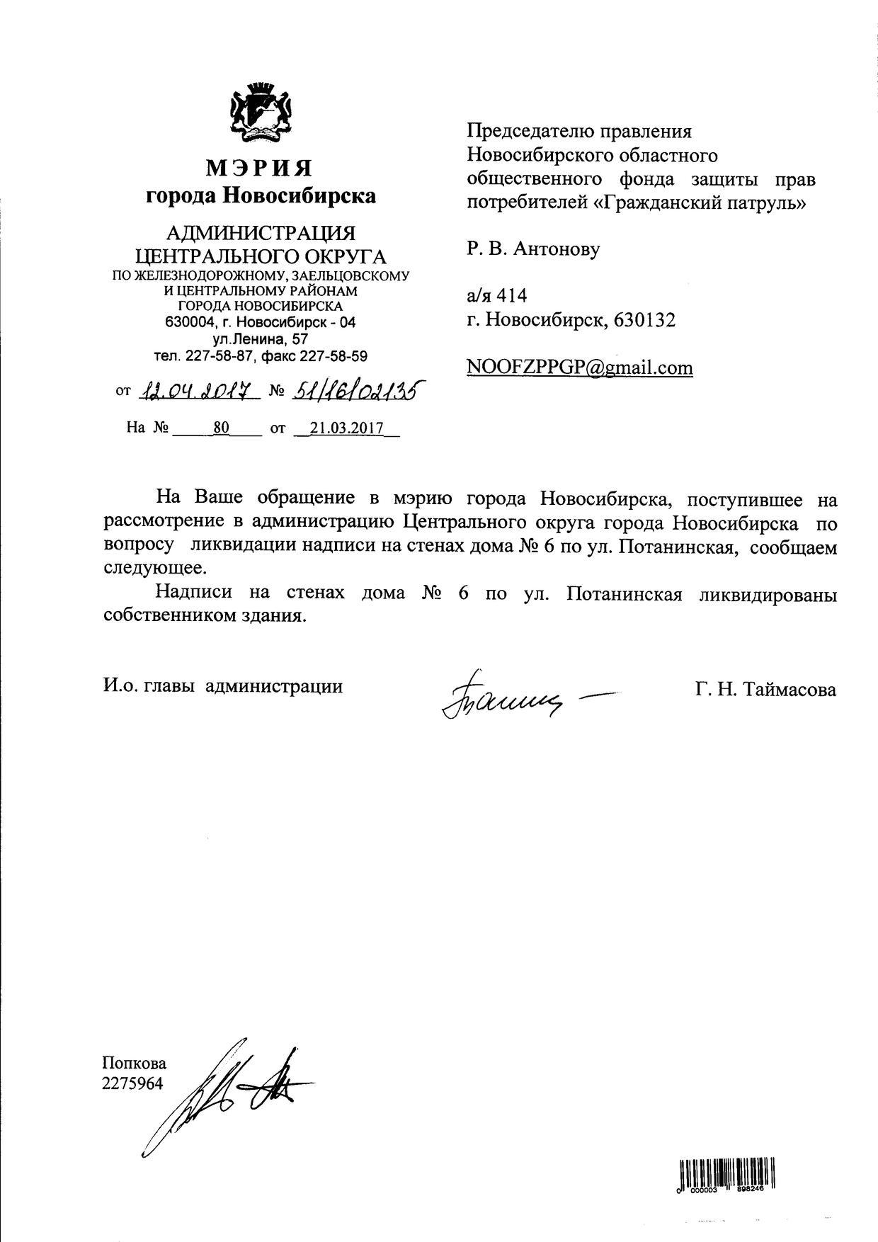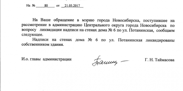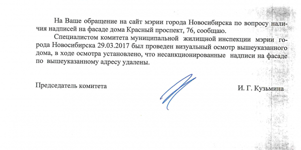 Номер жалобы:15695 Тип жалобы:Иные проблемы ЖКХ Название объекта:Управляющая Компания Город:Новосибирск Адрес:Новосибирск, Красный проспект, 76 Описание жалобы:Надписи на фасаде Статус: