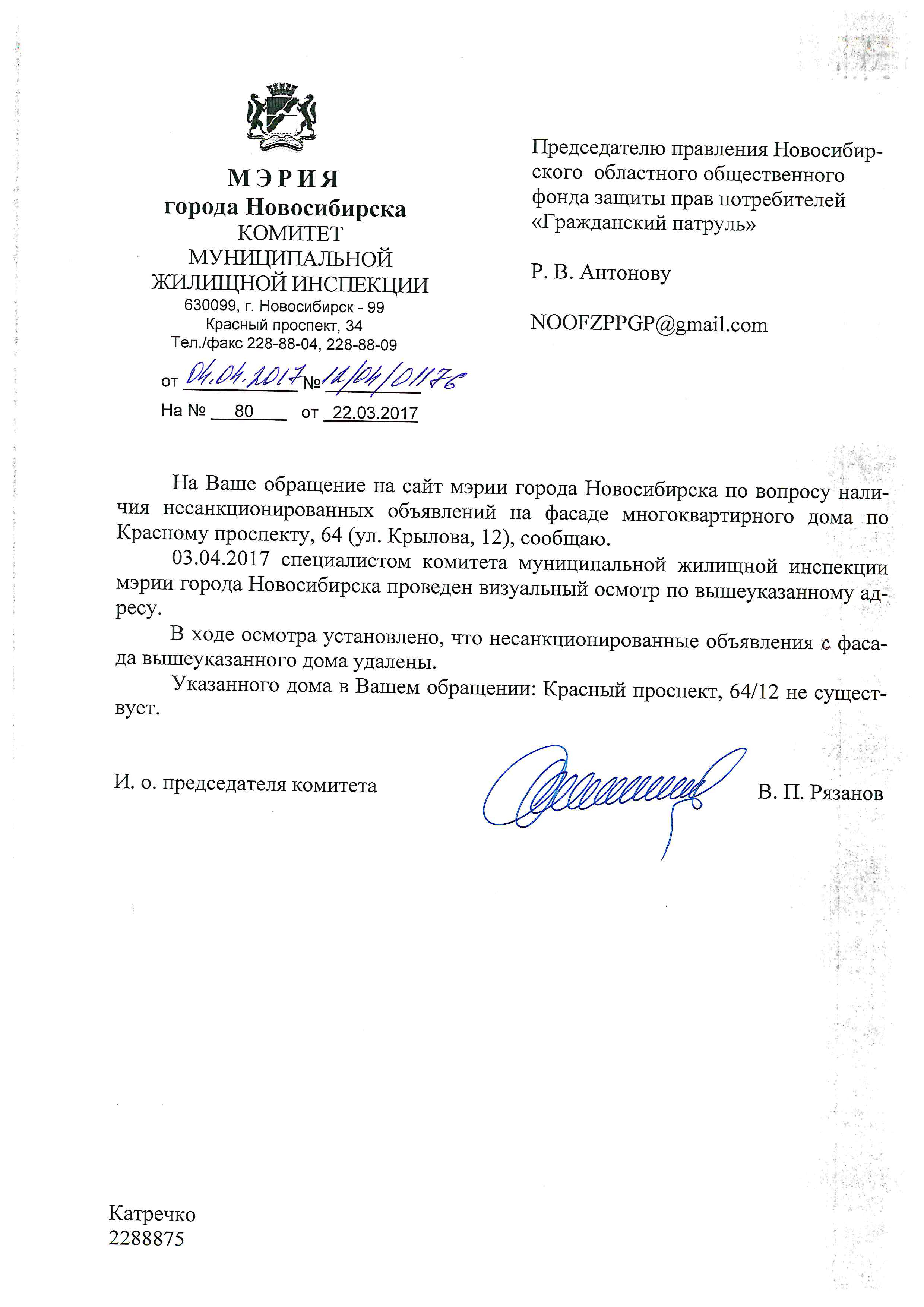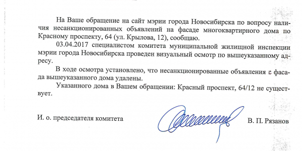 Номер жалобы:15651 Тип жалобы:Иные проблемы ЖКХ Название объекта:Управляющая Компания Город:Новосибирск Адрес:Новосибирск, Красный проспект, 64/12 Описание жалобы:Красный проспект 64 объявления в неположенном месте Статус: