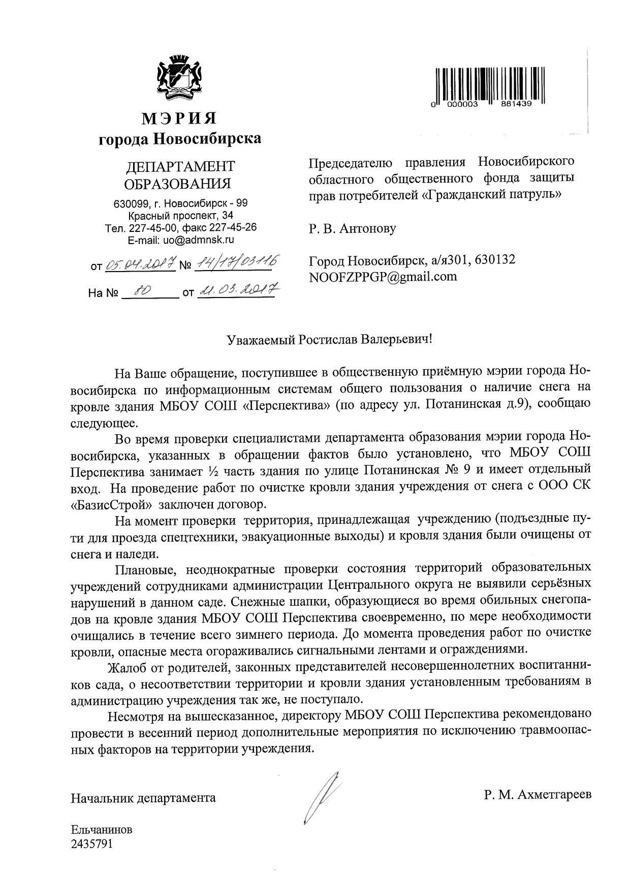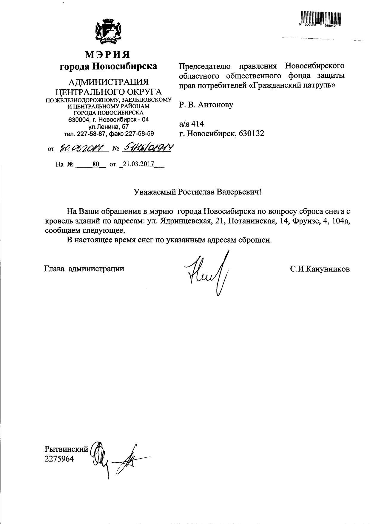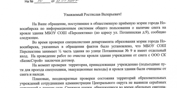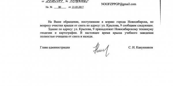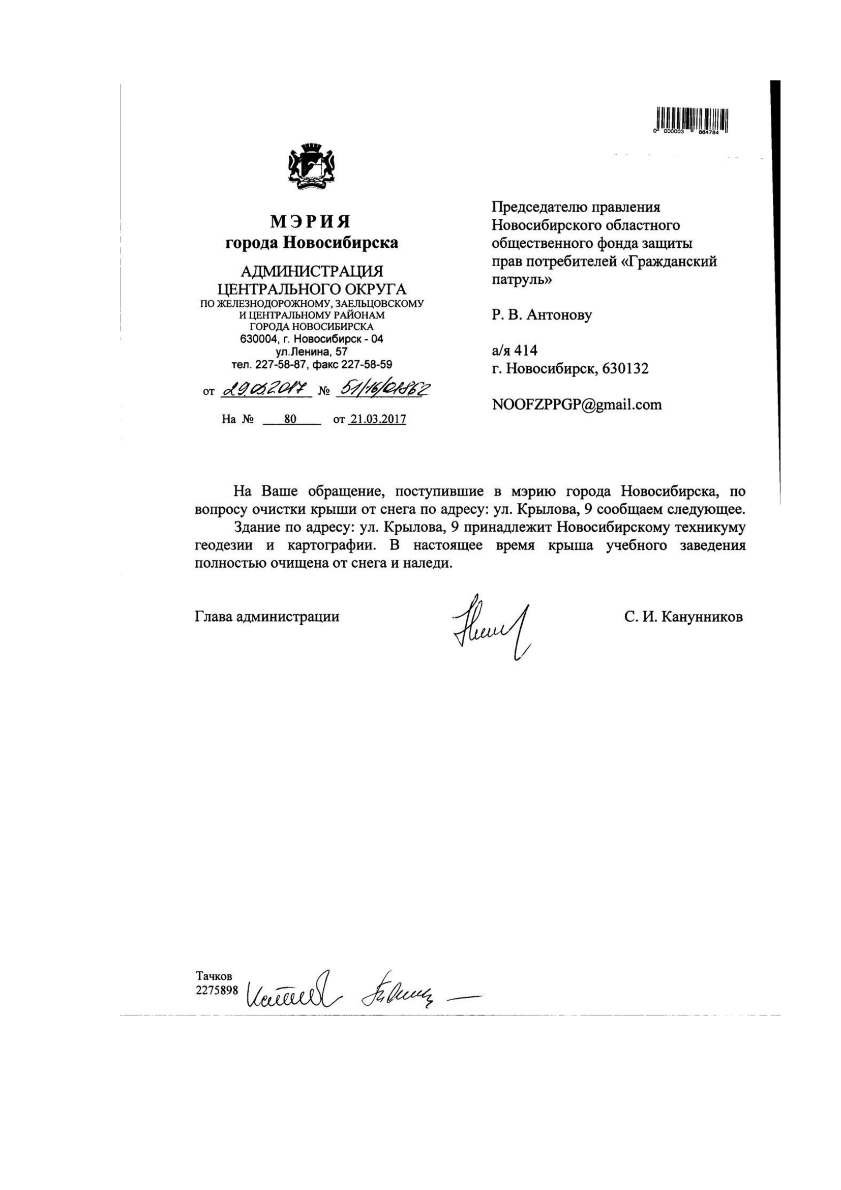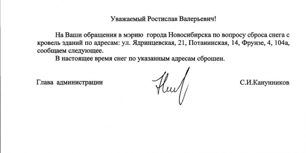 Номер жалобы:15650 Тип жалобы:Иные проблемы ЖКХ Название объекта:Администрация Город:Новосибирск Адрес:Новосибирск, улица Крылова, 9 Описание жалобы:Снег на крыше Статус: