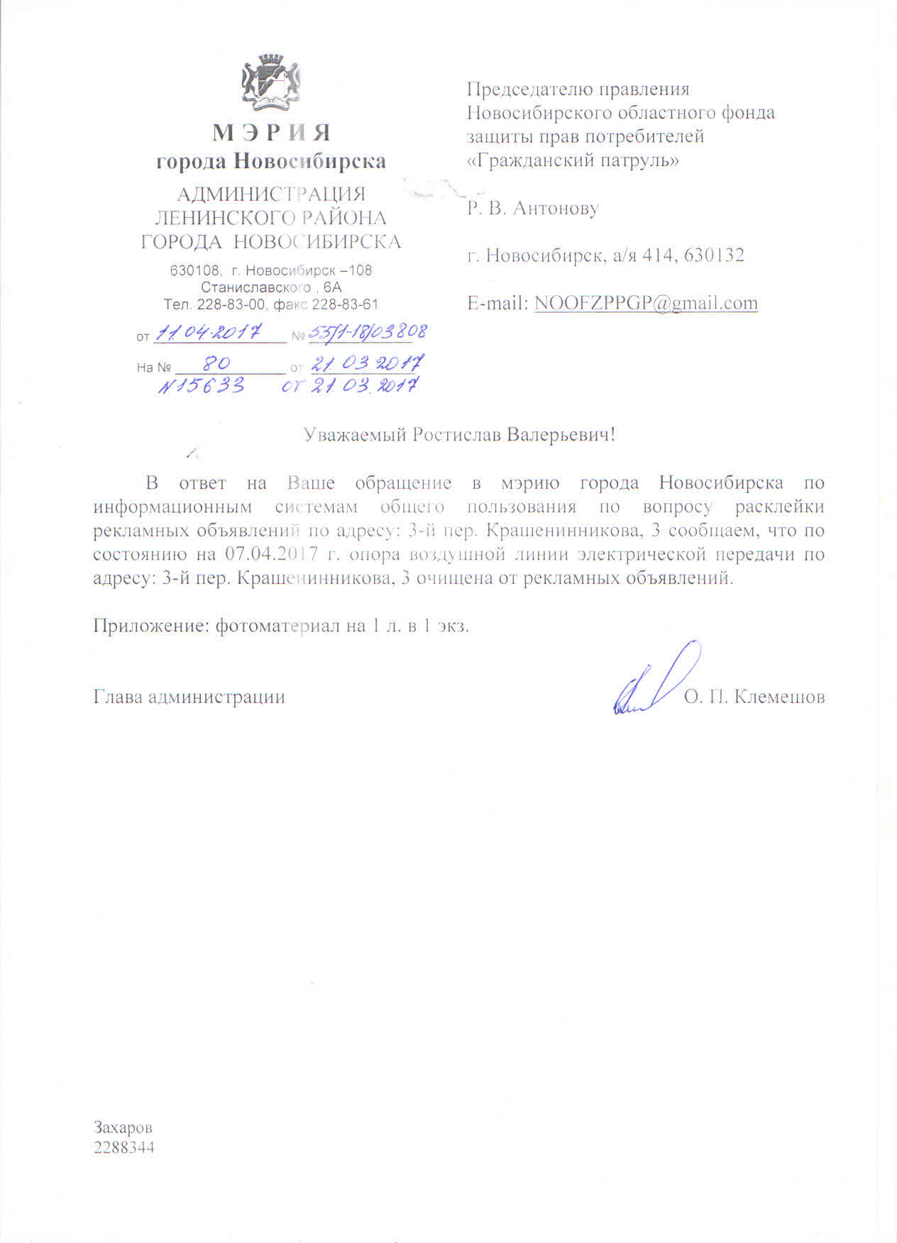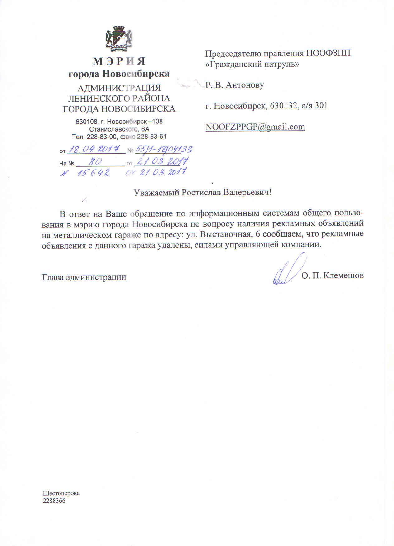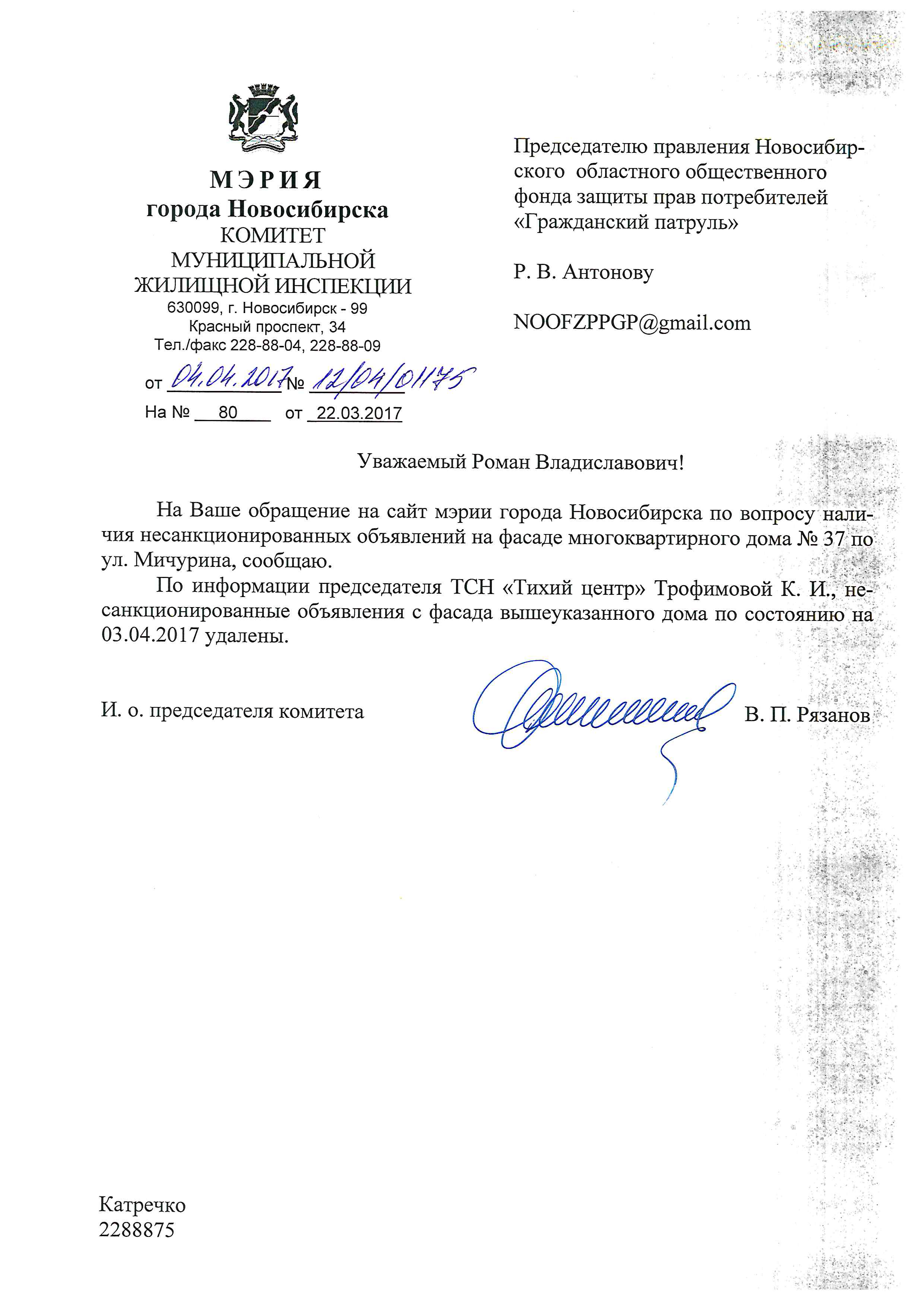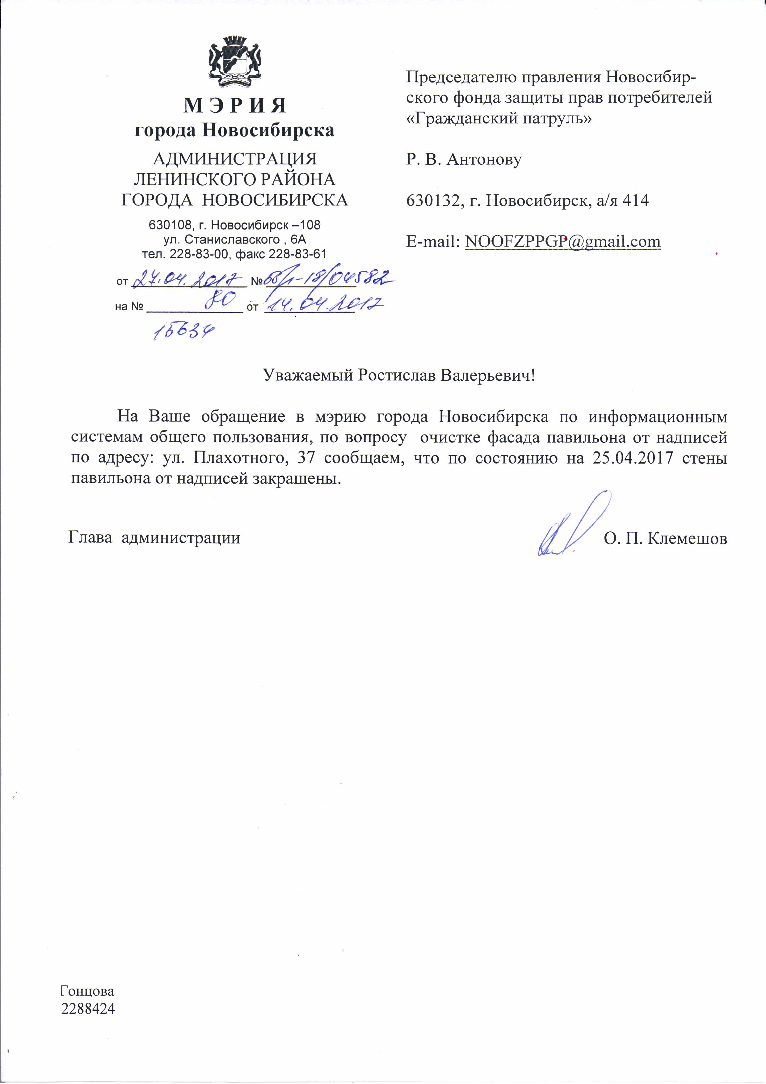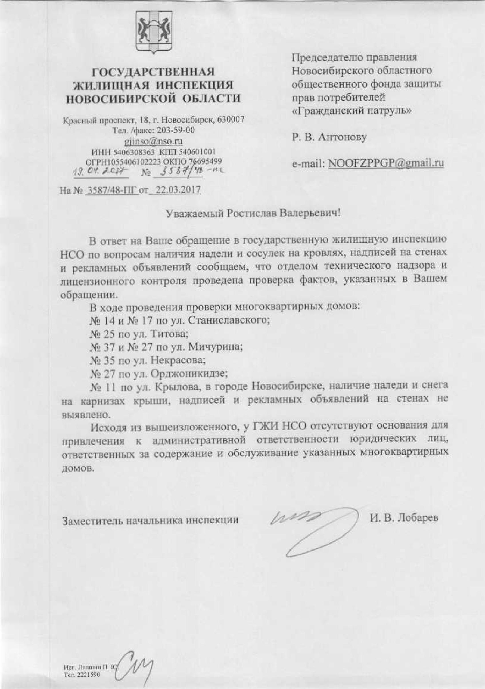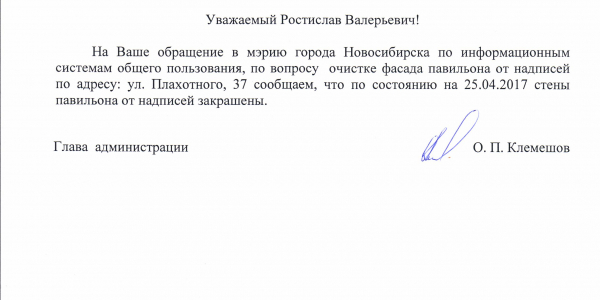 Номер жалобы:15647 Тип жалобы:Иные проблемы ЖКХ Название объекта:Управляющая Компания Город:Новосибирск Адрес:Новосибирск, Красный проспект, 76 Описание жалобы:Надписи Статус: