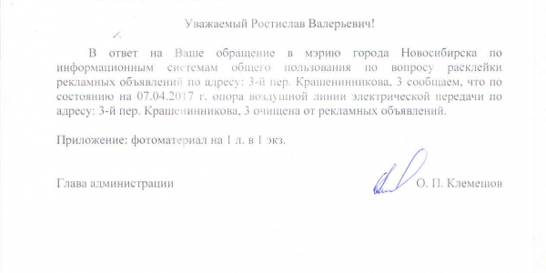 Номер жалобы:15633 Тип жалобы:Иные проблемы ЖКХ Название объекта:Управляющая Компания Город:Новосибирск Адрес:Новосибирск, 3-й переулок Крашенинникова 3 Описание жалобы:Третий Крашенинникова переулок три объявления в неположенном месте Статус: