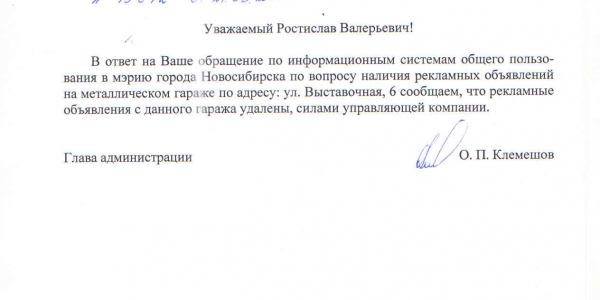 Номер жалобы:15642 Тип жалобы:Иные проблемы ЖКХ Название объекта:Управляющая Компания Город:Новосибирск Адрес:Новосибирск, Выставочная улица, 5 Описание жалобы:Рядом с домом на гараже много объявлений Статус:
