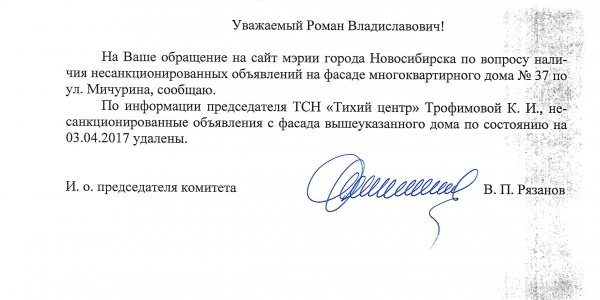 Номер жалобы:15645 Тип жалобы:Иные проблемы ЖКХ Название объекта:Управляющая Компания Город:Новосибирск Адрес:Новосибирск, улица Мичурина, 37 Описание жалобы:Объявления в неположенном месте Статус: