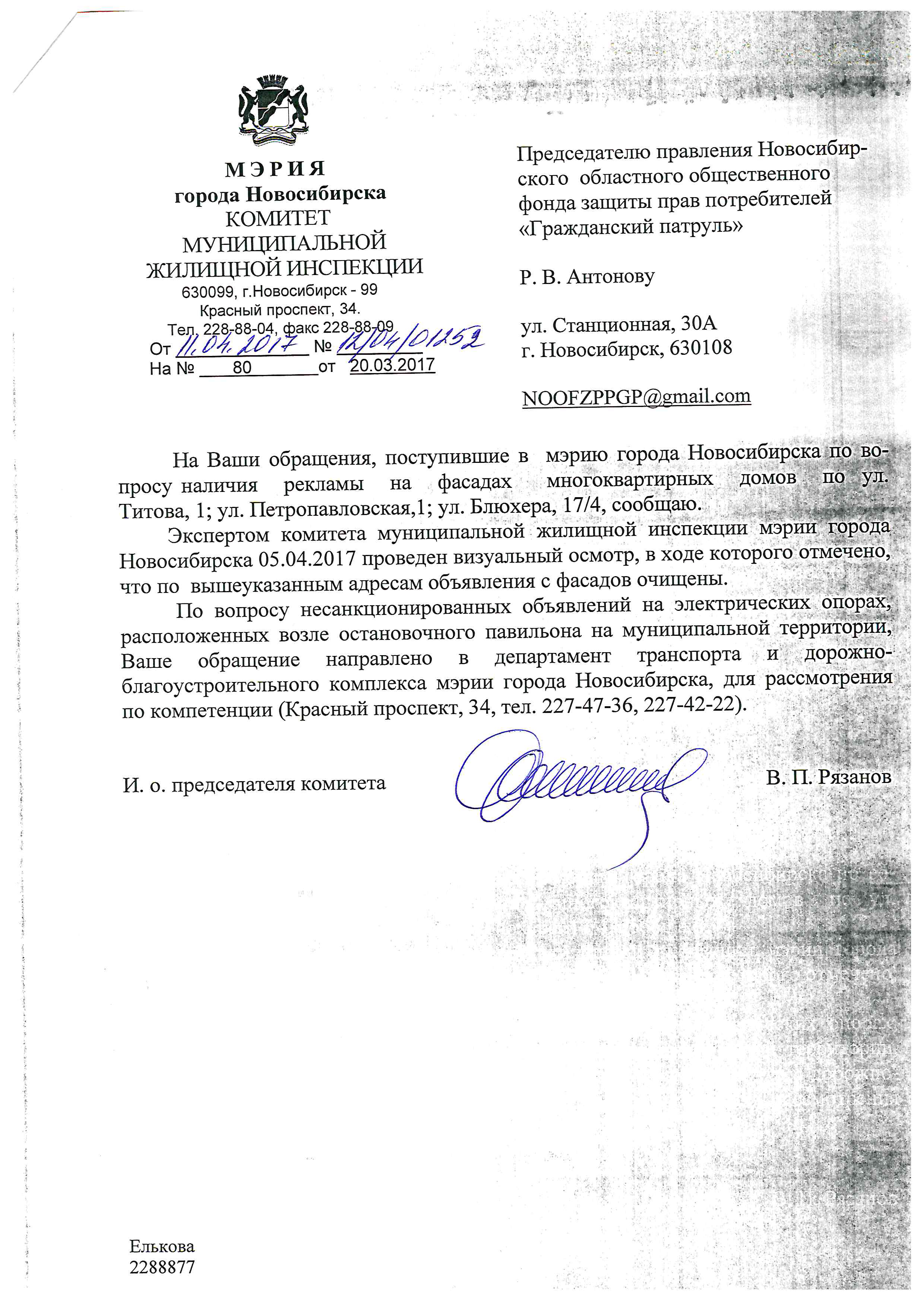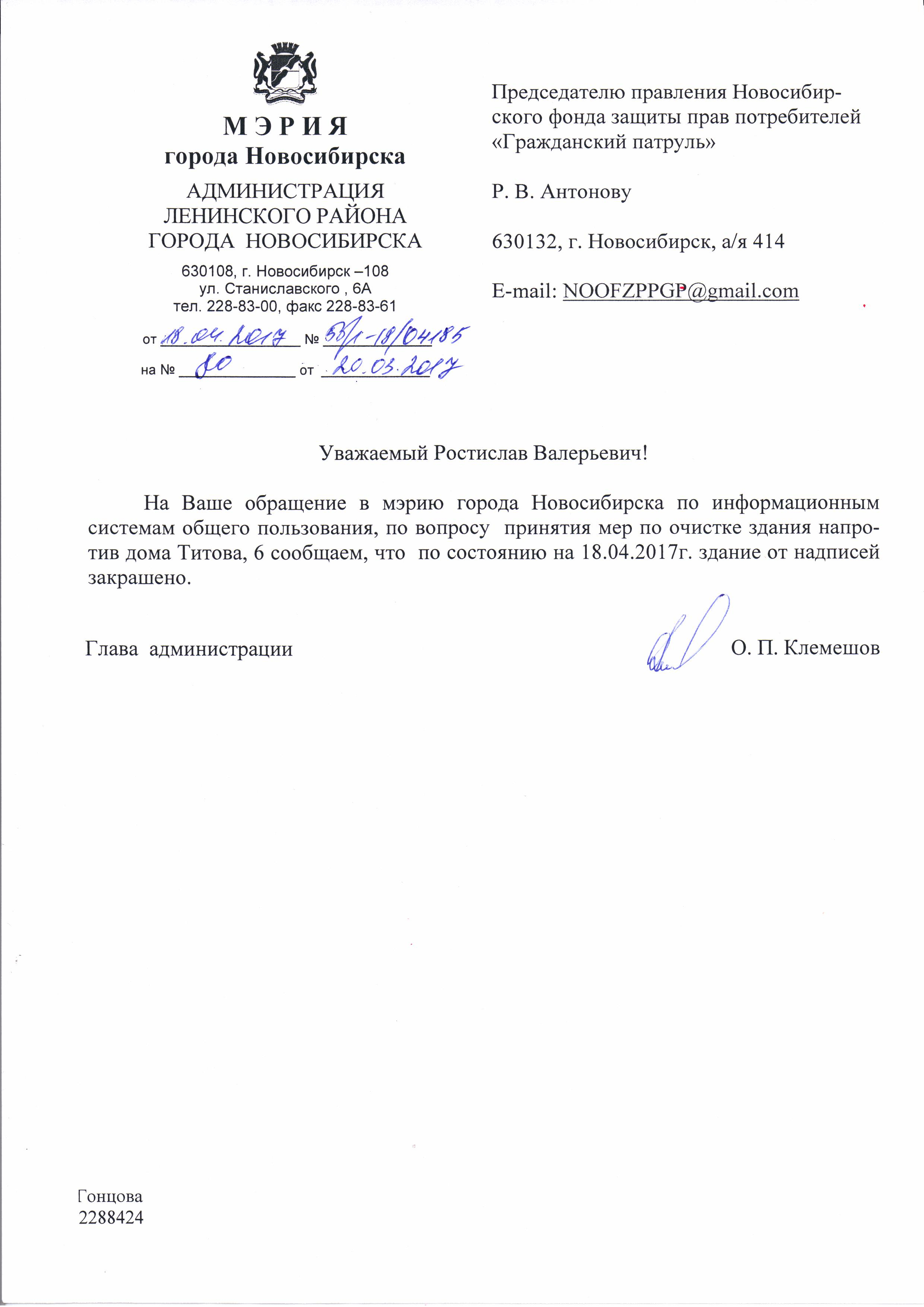 Номер жалобы:15466 Тип жалобы:Иные проблемы ЖКХ Название объекта:Управляющая Компания Город:Новосибирск Адрес:Новосибирск, улица Блюхера, 17/4 Описание жалобы:Надписи Статус: