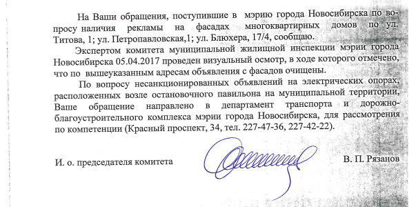 Номер жалобы:15467 Тип жалобы:Иные проблемы ЖКХ Название объекта:Управляющая Компания Город:Новосибирск Адрес:Новосибирск, улица Титова, 4 Описание жалобы:Объявления на фасаде Статус: