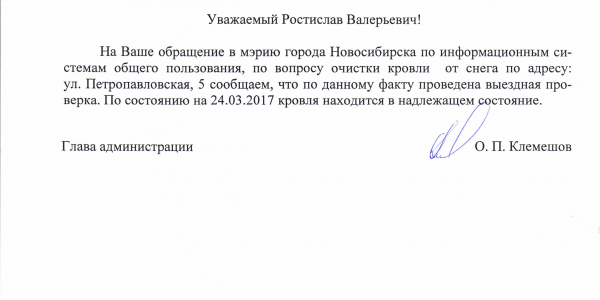 Номер жалобы:15455 Тип жалобы:Иные проблемы ЖКХ Название объекта:Управляющая Компания Город:Новосибирск Адрес:Новосибирск, Петропавловская улица, 5А Описание жалобы:Снег на крыше дома Статус: