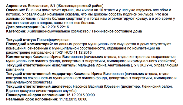 Номер жалобы:15345 Тип жалобы:Иные проблемы ЖКХ Название объекта:Управляющая компания "ЖЭУ-4" Регион:Новосибирская область Город:Новосибирск Адрес:Вокзальная Магистраль 8/1 Описание жалобы:В нашем доме, по адресу Вокзальная Магистраль 8/1 3й год течет крыша. Наша квартира находится на последнем этаже и каждую весну и осень с потолка начинает течь вода. Сначало обращались в ЖЭУ, нам ответили, что нужно собирать подписи жильцов, что все готовы платить больше, чтобы крышу отремонтировали. Потом обратились через ресурс мой новосибирск, сразу пришли из ЖЭУ, повозились там, сказали почистили, прошло несколько месяцев и опять начало течь. Сколько мы не обращались снова, реакции от ЖЭУ никакой, а ремонт в квартире испорчен очень сильно и крыша не перестает течь. Сейчас весна и снова дома потоп. Статус: