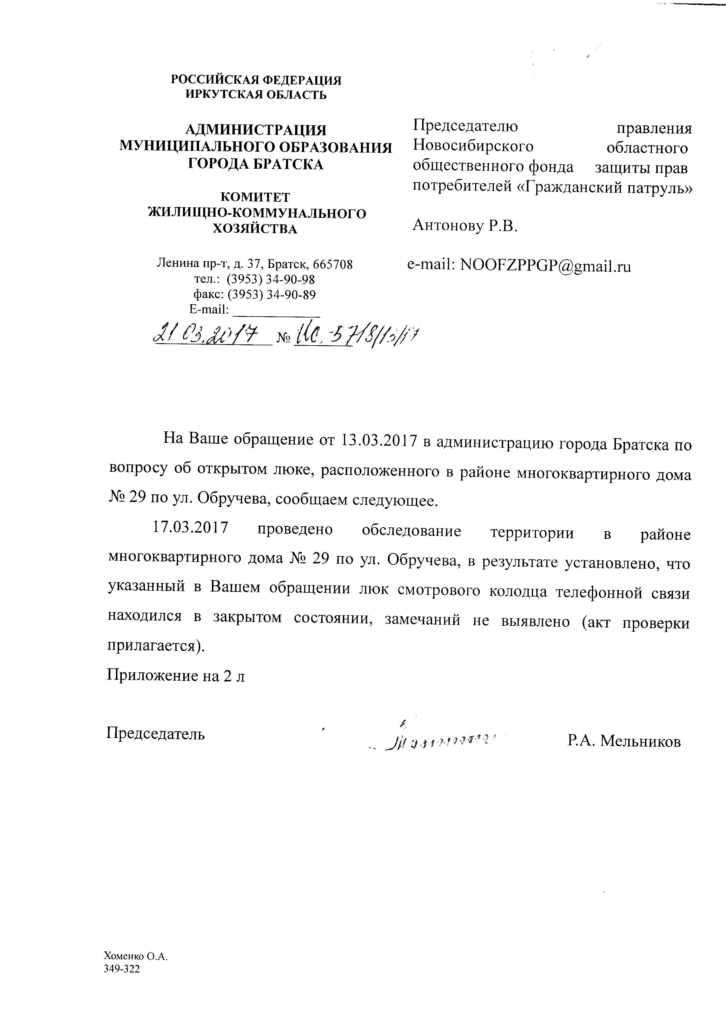 Номер жалобы:15331 Тип жалобы:Иные проблемы ЖКХ Название объекта:Администрации Регион:Иркутская область Город:Братск Адрес:ул. Обручева, 29 Описание жалобы:Открыт люк со стороны улицы Статус: