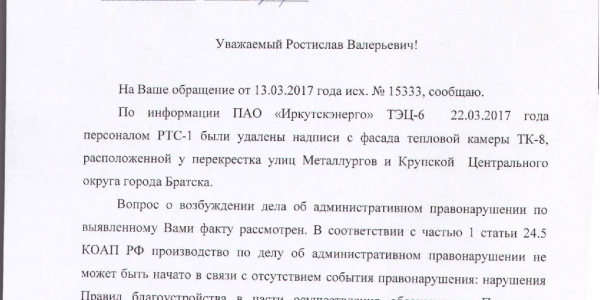 Номер жалобы:15333 Тип жалобы:Иные проблемы ЖКХ Название объекта:Администрации Регион:Иркутская область Город:Братск Адрес:Комсомольская ул., 91 Описание жалобы:Надписи на фасаде подстанции Статус: