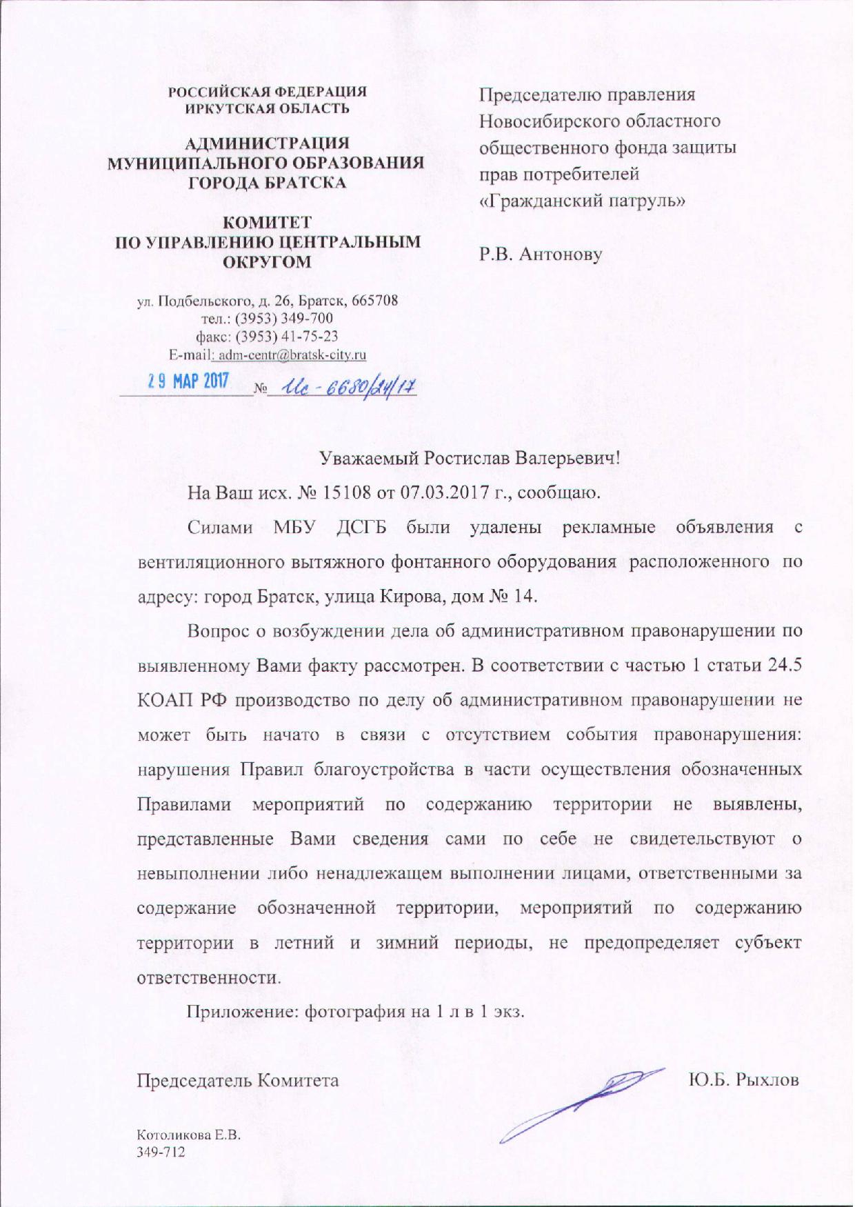 Номер жалобы:15108 Тип жалобы:Иные проблемы ЖКХ Название объекта:Администрации Регион:Иркутская область Город:Братск Адрес:ул. Кирова, 14 Описание жалобы:Загрязнение столба многолетнее Статус: