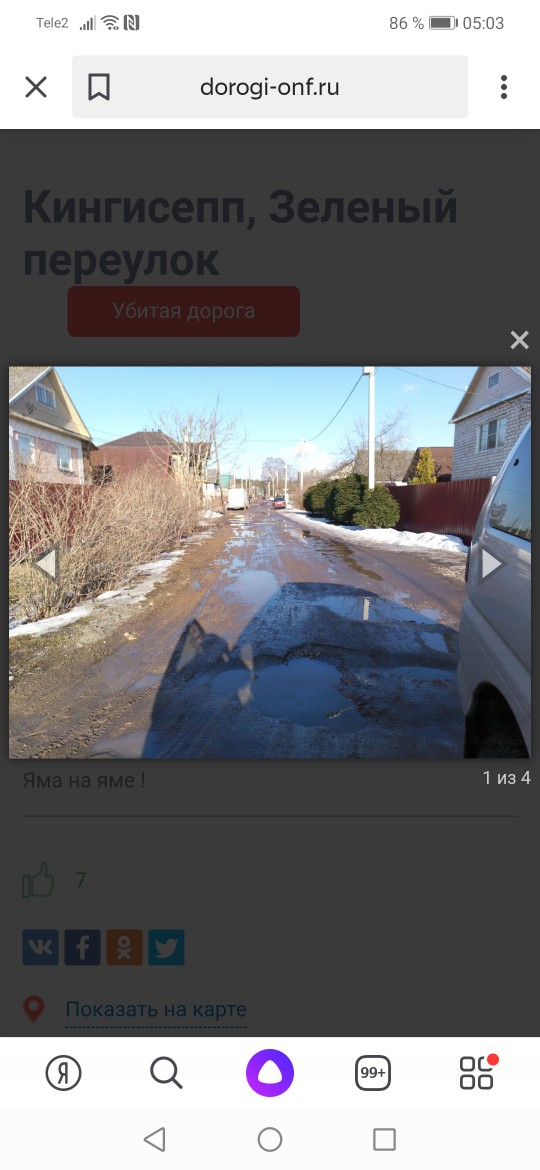 Номер жалобы:65438 Тип жалобы:Прочее Название объекта: Регион:Ленинградская область Город:Кингисепп Адрес:Кингисепп, Зелёный переулок, 13 Описание жалобы:Наши дороги Статус: