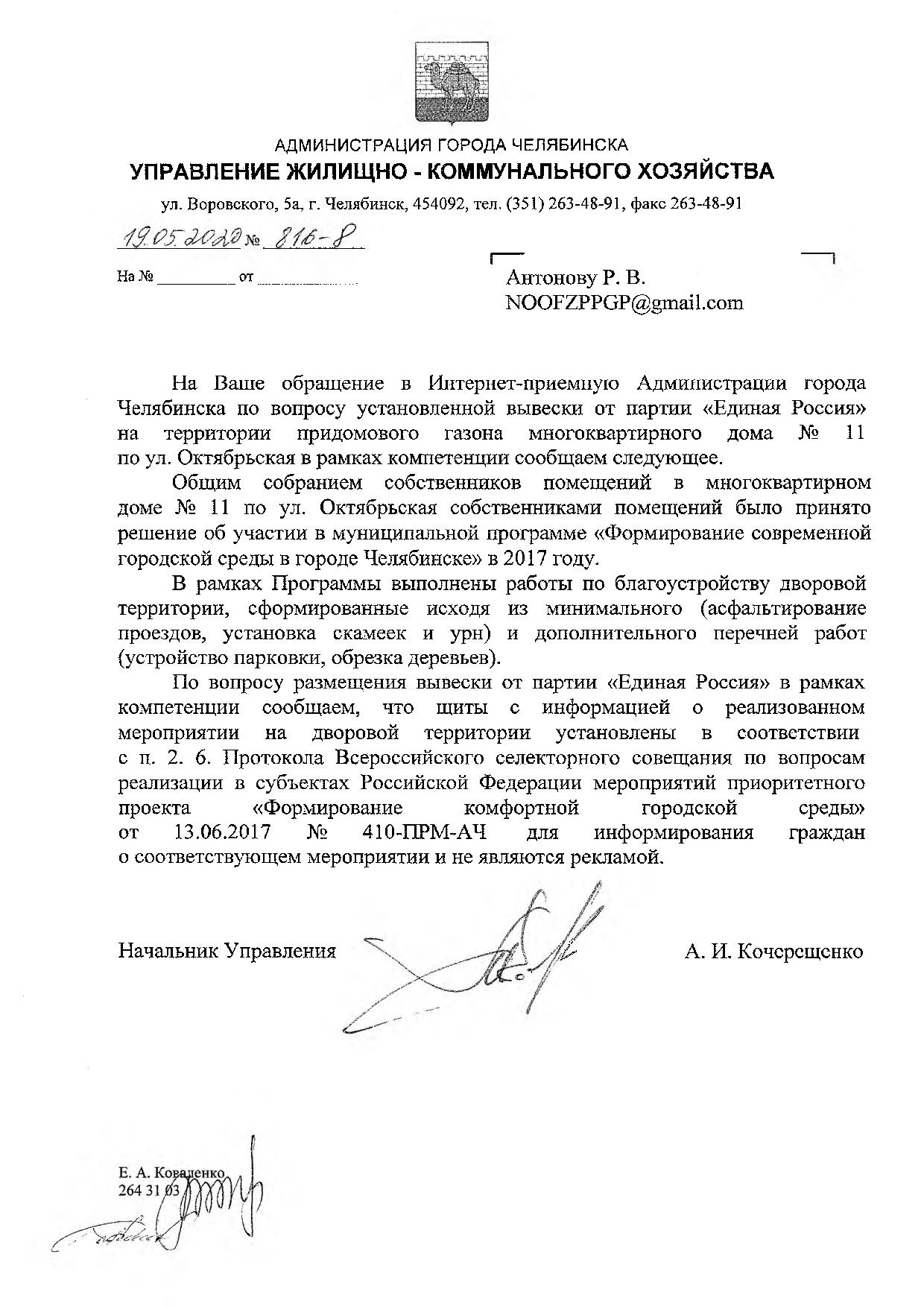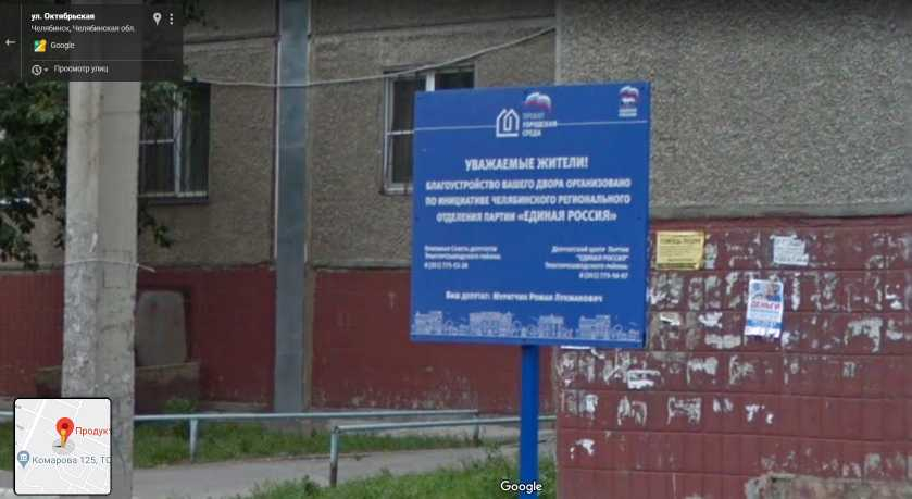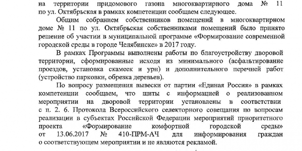 Номер жалобы:65478 Тип жалобы:Прочее Название объекта: Регион:Челябинская область Город:Челябинск Адрес:Октябрьская улица, 11 Описание жалобы:На северном выходе со двора установлен незаконный рекламный столбик (информационная конструкция) партии "Единая Россия". Прямо на газоне. Это незаконная реклама, ни с кем не согласованная. Требуем демонтаж и восстановление газона. Также необходимо прикрепить фото выполненных работ. Статус: