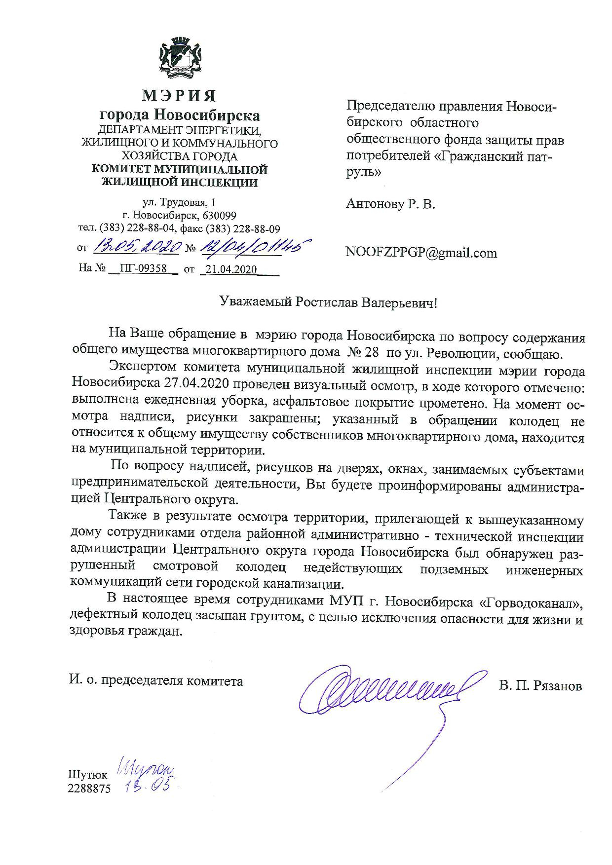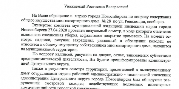 Номер жалобы:65480 Тип жалобы:Улица (ямы на тротуарах, нет освещения, ветхие деревья и т.д.) Название объекта: Регион:Новосибирская область Город:Новосибирск Адрес:Революции, 28 Описание жалобы:на углу дома, со стороны улицы Депутатская, надписи на жалюзях и закраска иного цвета на стене здания, что недопустимо согласно правилам благоустройства города. она делает здание грязным и неприятным. кроме того, там же напротив этих надписей, между тротуаром и дорогой на газоне открытый колодец, который вместо люка накрыт дощечками. опасно для всюду бегающих маленьких детей Статус: