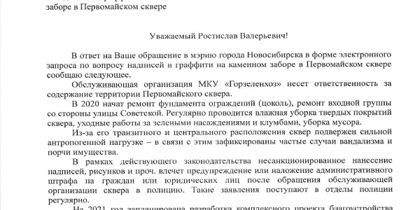 Номер жалобы:65381 Тип жалобы:Прочее Название объекта: Регион:Новосибирская область Город:Новосибирск Адрес:Советская улица, 31 Описание жалобы:Каменный забор Первомайского сквера весь в надписях и графити по всей длине. Статус: