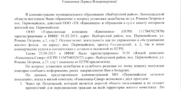 Номер жалобы:65451 Тип жалобы:Прочее Название объекта: Регион:Ленинградская область Город:коттеджный посёлок Кивеннапа Север Адрес:коттеджный посёлок Кивеннапа Север, коттеджный посёлок Кивеннапа Север Описание жалобы:Установлен не законно шлагбаум. Мешает проезду. И требует финансовых затрат. Было решение суда. Множество обращений нечего не решилось председатель товарищества 89218719670 Статус: