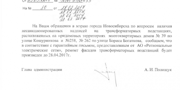Номер жалобы:14885 Тип жалобы:Иные проблемы ЖКХ Название объекта:Управляющая Компания Город:Новосибирск Адрес:Новосибирск, улица Бориса Богаткова, 241 Описание жалобы:Надписи на стенах дома Статус: