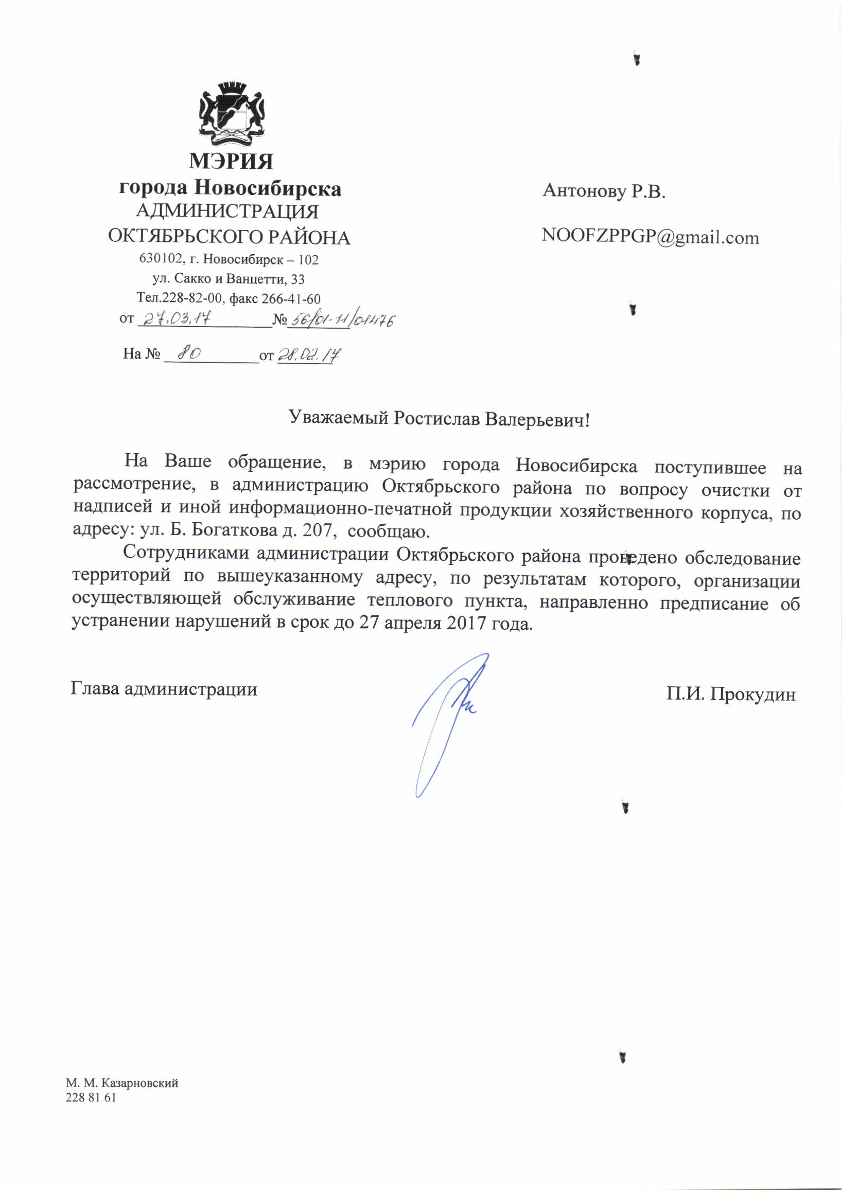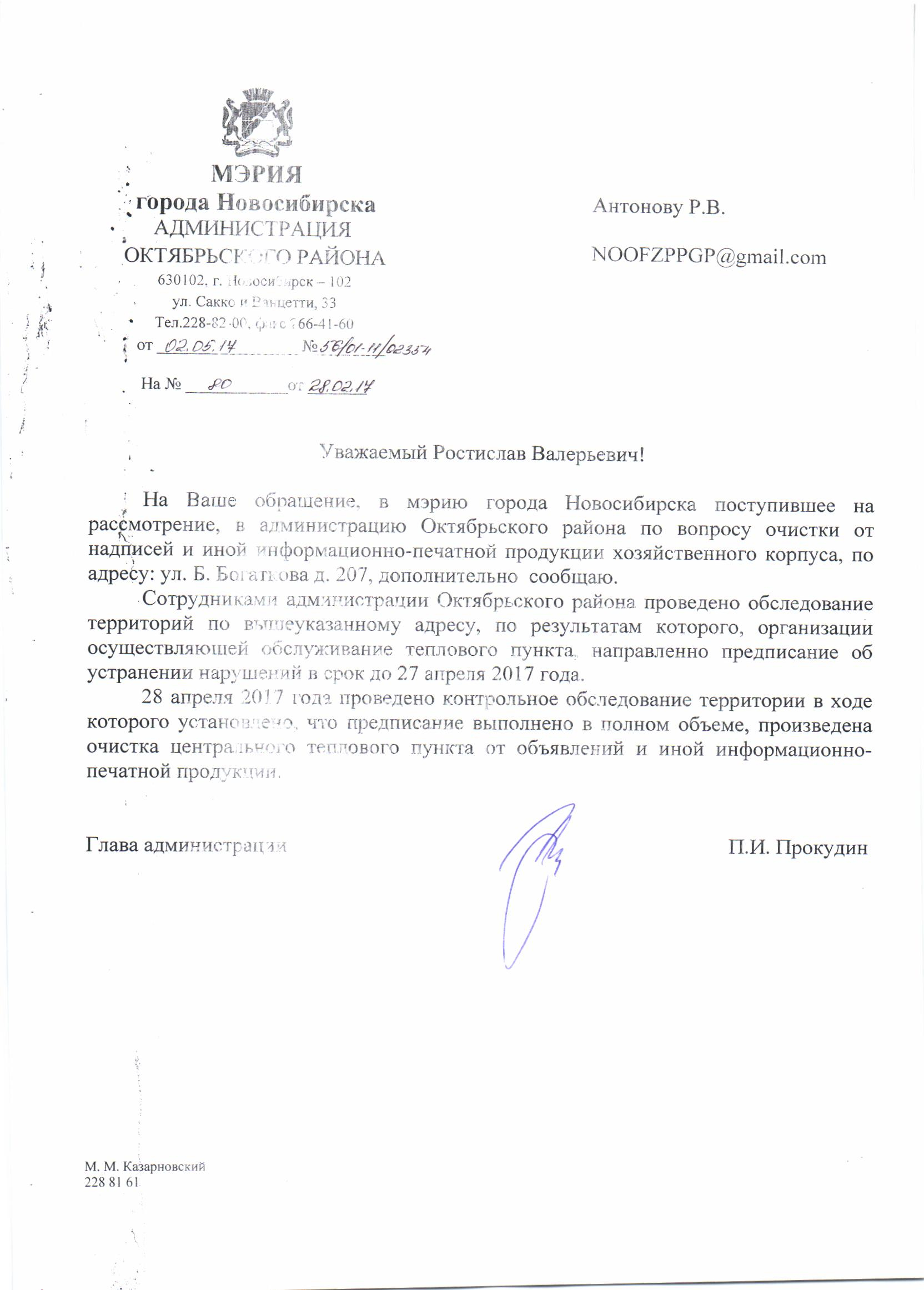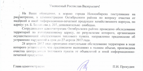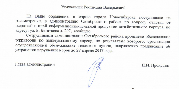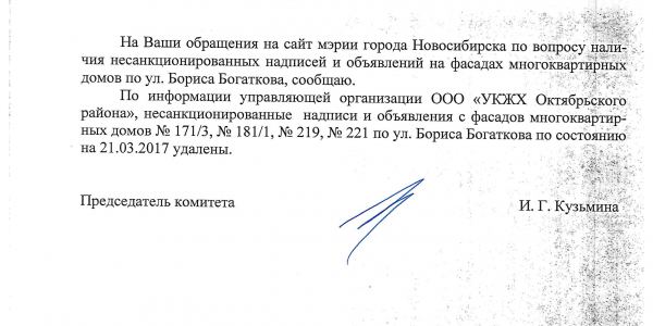 Номер жалобы:14852 Тип жалобы:Иные проблемы ЖКХ Название объекта:Управляющая Компания Город:Новосибирск Адрес:Новосибирск, улица Бориса Богаткова, 207 Описание жалобы:Объявление и надписи на стенах хозяйственного корпуса вблизи дома Статус: