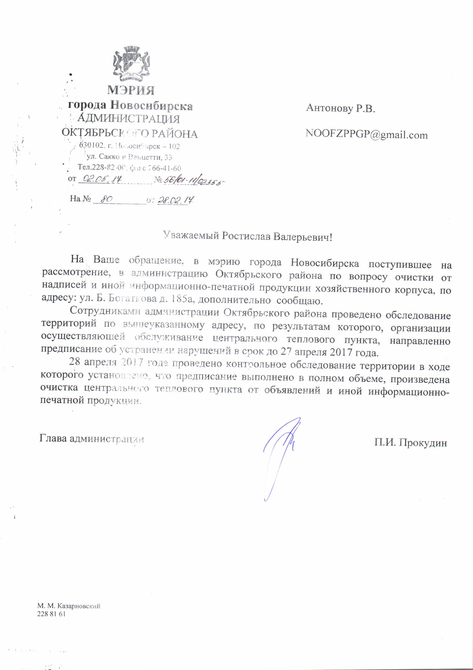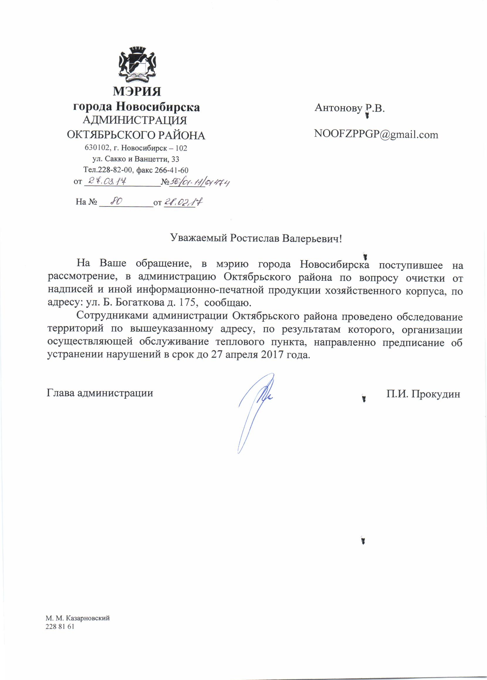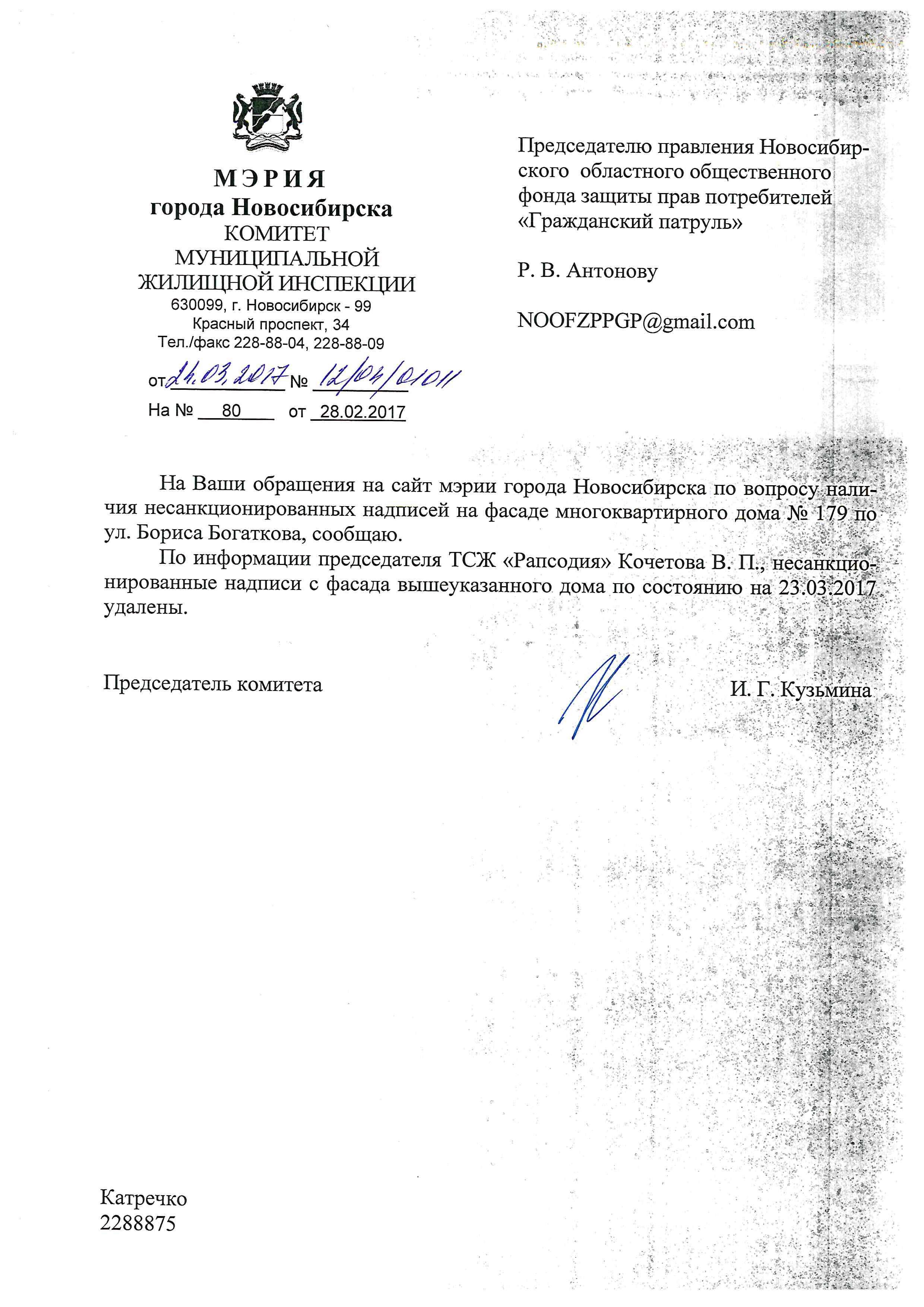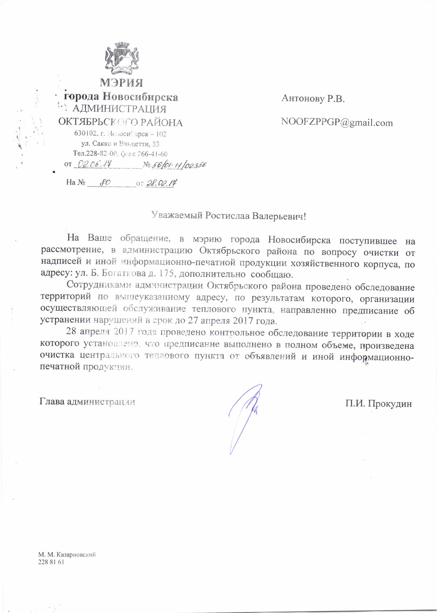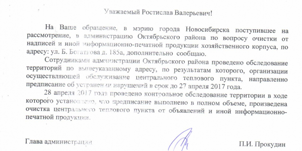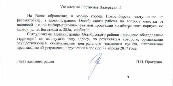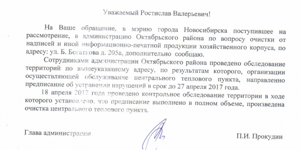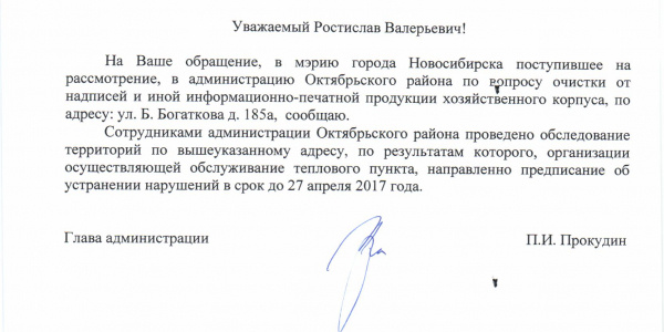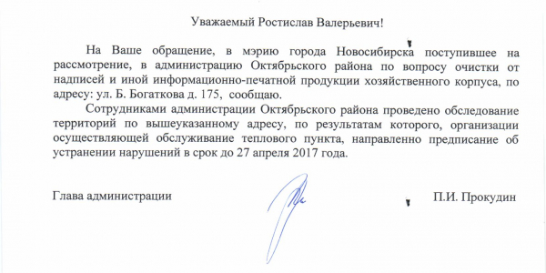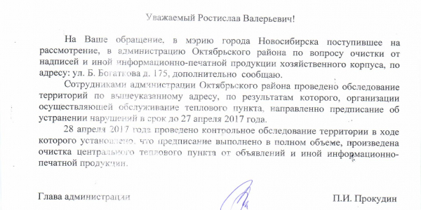 Номер жалобы:14835 Тип жалобы:Иные проблемы ЖКХ Название объекта:Управляющая Компания Город:Новосибирск Адрес:Новосибирск, улица Бориса Богаткова, 179 Описание жалобы:Объявление и надписи на хозяйственном корпусе Статус: