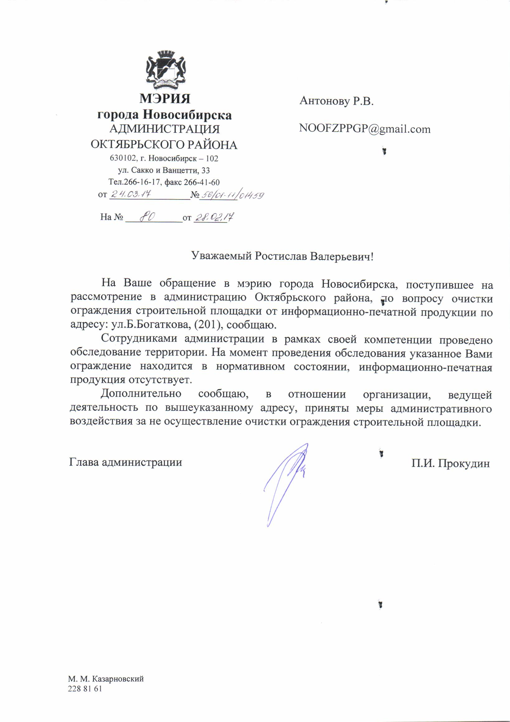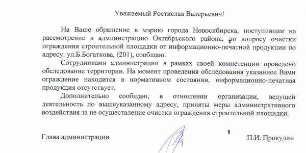 Номер жалобы:14843 Тип жалобы:Иные проблемы ЖКХ Название объекта:Управляющая Компания Город:Новосибирск Адрес:Новосибирск, улица Бориса Богаткова, 201 Описание жалобы:На заборе объявления Статус: