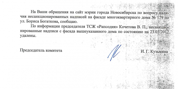Номер жалобы:14840 Тип жалобы:Иные проблемы ЖКХ Название объекта:Управляющая Компания Город:Новосибирск Адрес:Новосибирск, улица Бориса Богаткова, 179 Описание жалобы:Надписи на стенах дома Статус: