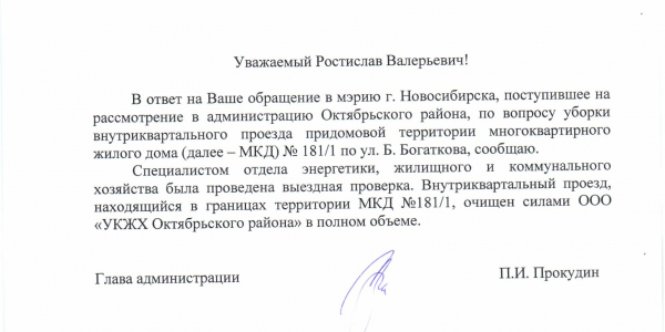 Номер жалобы:14837 Тип жалобы:Иные проблемы ЖКХ Название объекта:Администрация Город:Новосибирск Адрес:Новосибирск, улица Бориса Богаткова, 181/1 Описание жалобы:Межквартальная дорога в снегу Статус: