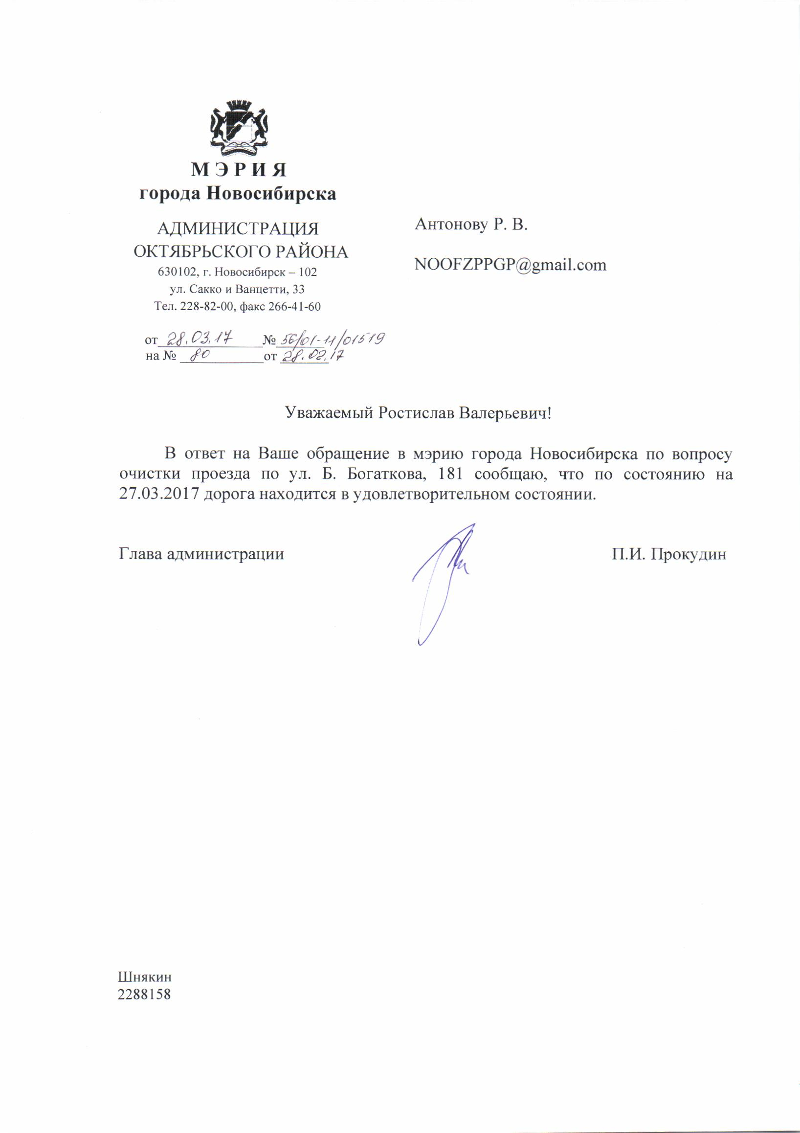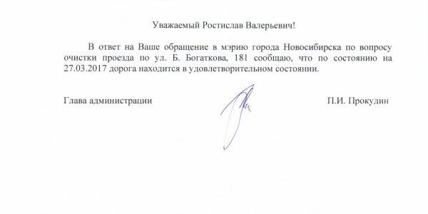 Номер жалобы:14833 Тип жалобы:Иные проблемы ЖКХ Название объекта:Администрация Город:Новосибирск Адрес:Новосибирск, улица Бориса Богаткова, 181 Описание жалобы:Межквартальная дорога в снегу Статус: