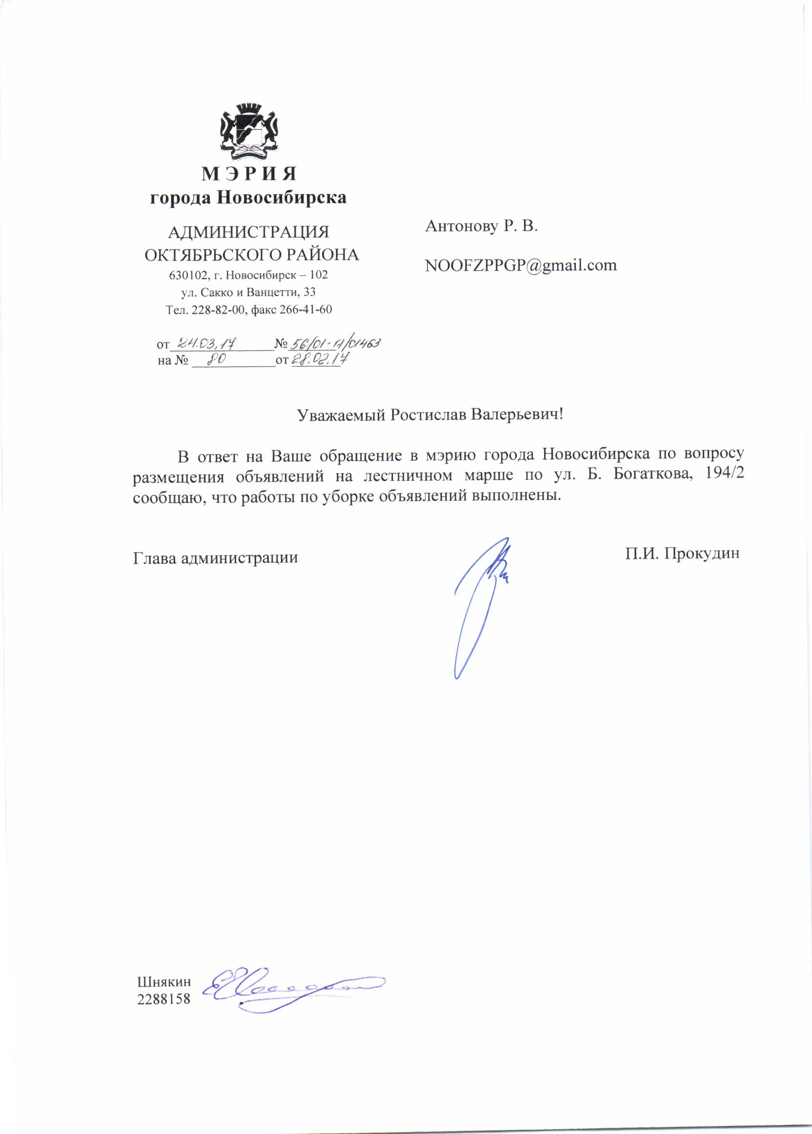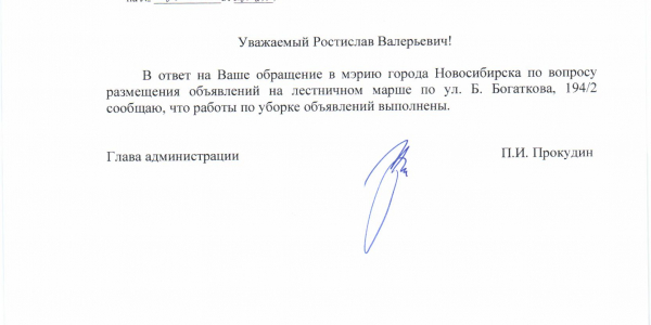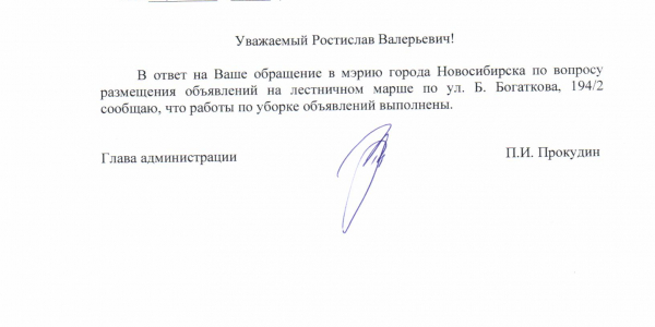 Номер жалобы:14812 Тип жалобы:Иные проблемы ЖКХ Название объекта:Управляющая Компания Город:Новосибирск Адрес:Новосибирск, улица Бориса Богаткова, 194/3 Описание жалобы:Объявления в неположенном месте Статус: