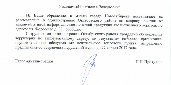 Номер жалобы:14811 Тип жалобы:Иные проблемы ЖКХ Название объекта:Управляющая Компания Город:Новосибирск Адрес:Новосибирск, улица Федосеева, 38 Описание жалобы:Рядом хозяйственный корпус в объявлениях и надписях Статус: