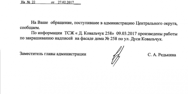 Номер жалобы:14729 Тип жалобы:Иные проблемы ЖКХ Название объекта:Управляющая Компания Город:Новосибирск Адрес:Новосибирск, улица Дуси Ковальчук, 258 Описание жалобы:Надписи на стенах дома Статус: