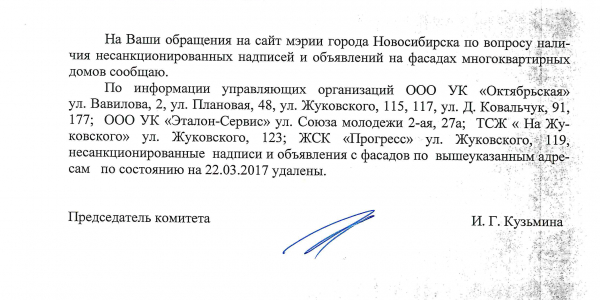Номер жалобы:14716 Тип жалобы:Иные проблемы ЖКХ Название объекта:Управляющая Компания Город:Новосибирск Адрес:Новосибирск, улица Дуси Ковальчук, 91/1 Описание жалобы:Надписи на сооружениях Статус: