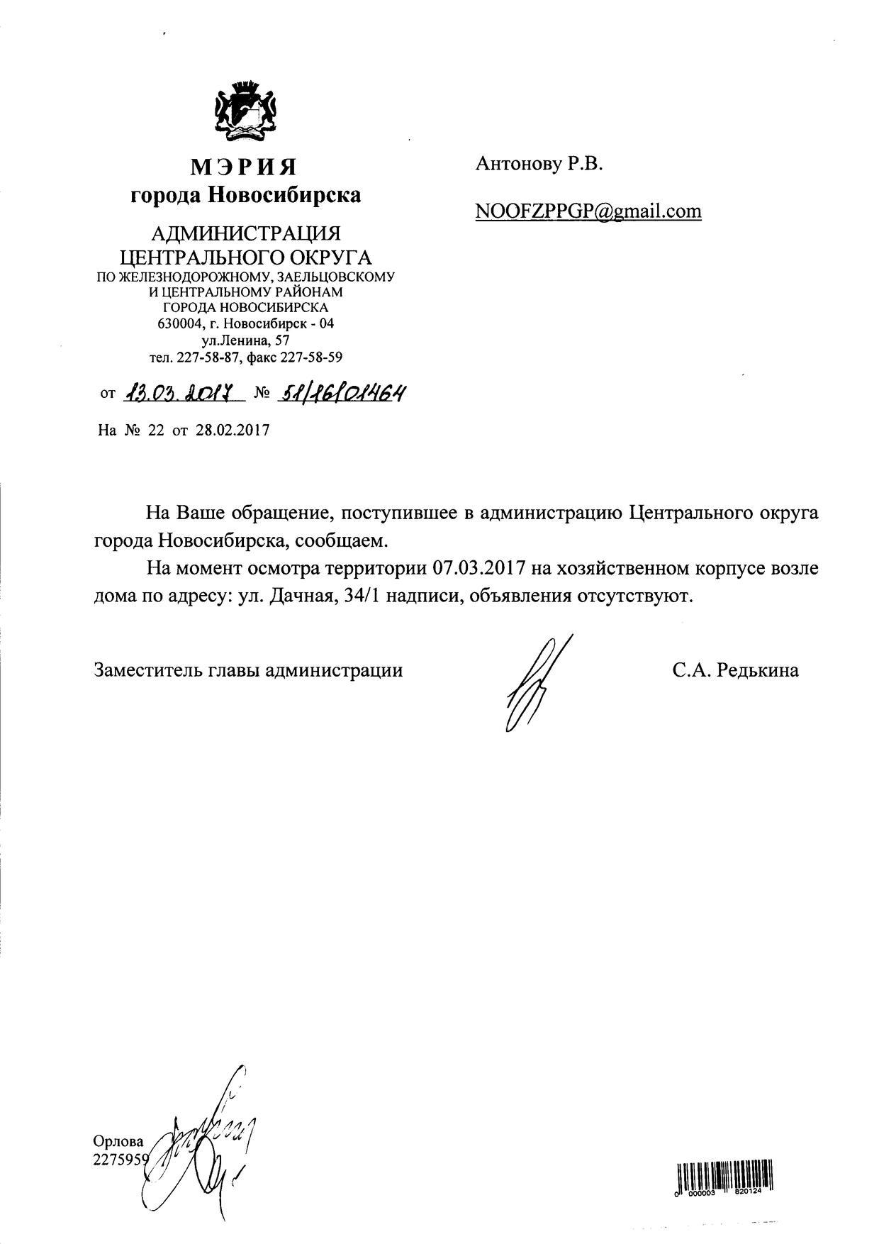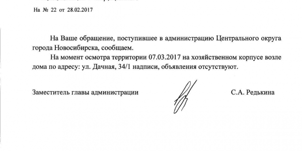 Номер жалобы:14696 Тип жалобы:Иные проблемы ЖКХ Название объекта:Управляющая Компания Город:Новосибирск Адрес:Новосибирск, улица Дачная, 34/1 Описание жалобы:Надписи объявление на хозяйственном корпусе Статус: