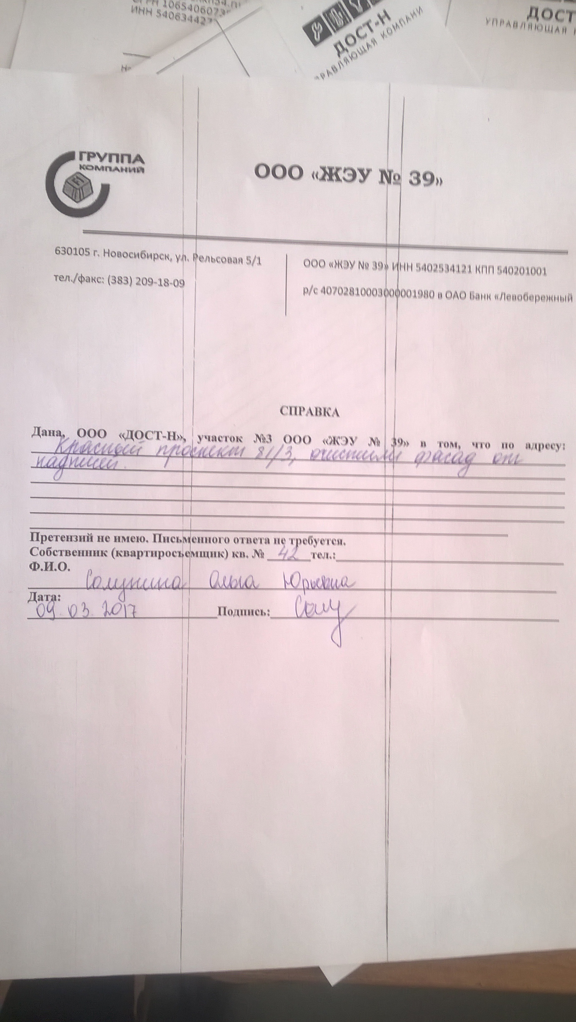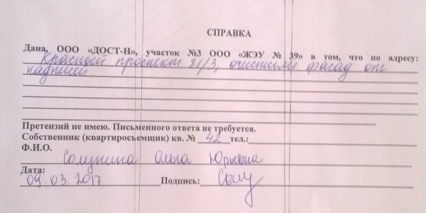 Номер жалобы:14584 Тип жалобы:Иные проблемы ЖКХ Название объекта:Управляющая Компания Город:Новосибирск Адрес:Новосибирск, Красный проспект, 81/3 Описание жалобы:Надписи и объявления в неположенном месте Статус: