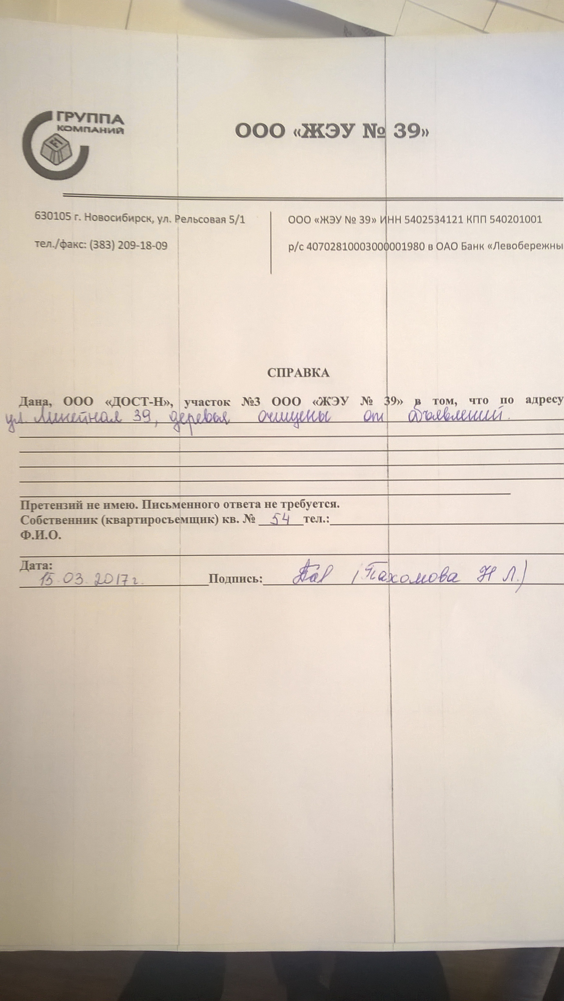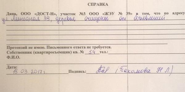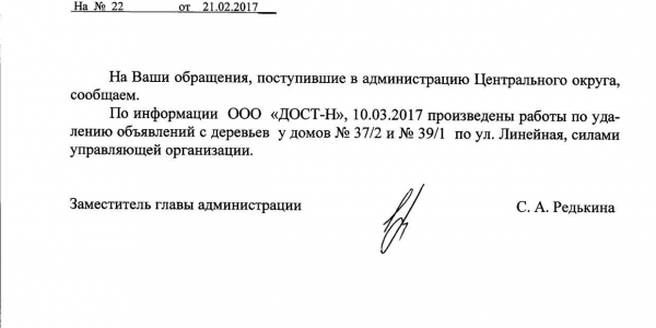 Номер жалобы:14582 Тип жалобы:Иные проблемы ЖКХ Название объекта:Управляющая Компания Город:Новосибирск Адрес:Новосибирск, улица Линейная, 39/1 Описание жалобы:Объявления на деревьях за домом Статус:
