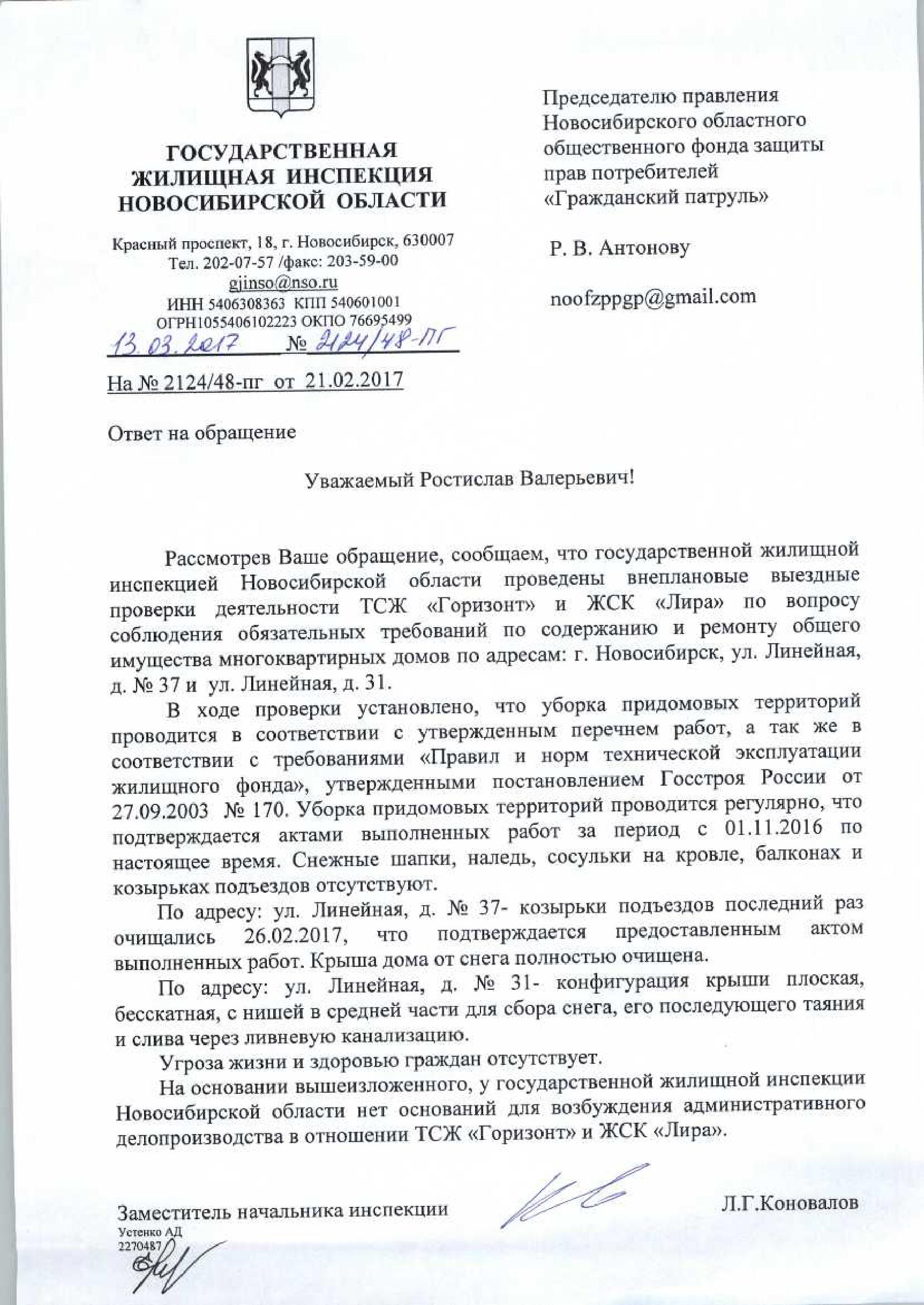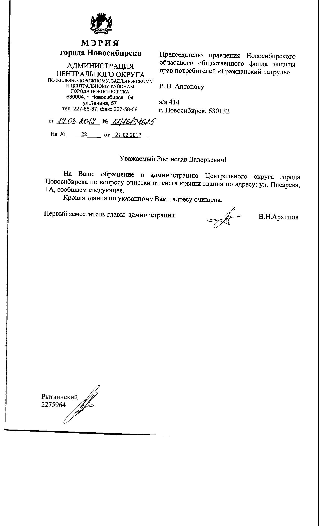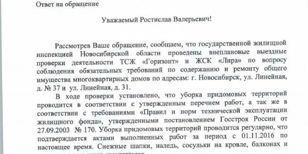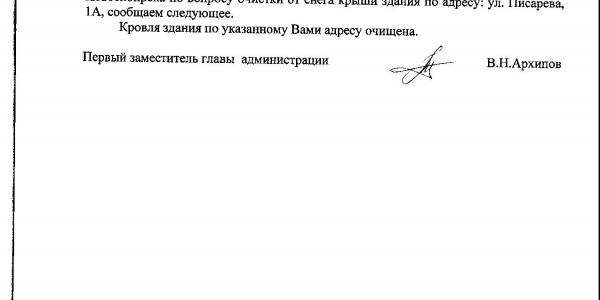 Номер жалобы:14589 Тип жалобы:Иные проблемы ЖКХ Название объекта:Управляющая Компания Город:Новосибирск Адрес:Новосибирск, улица Писарева, 1А Описание жалобы:не убран снег на крыше Статус: