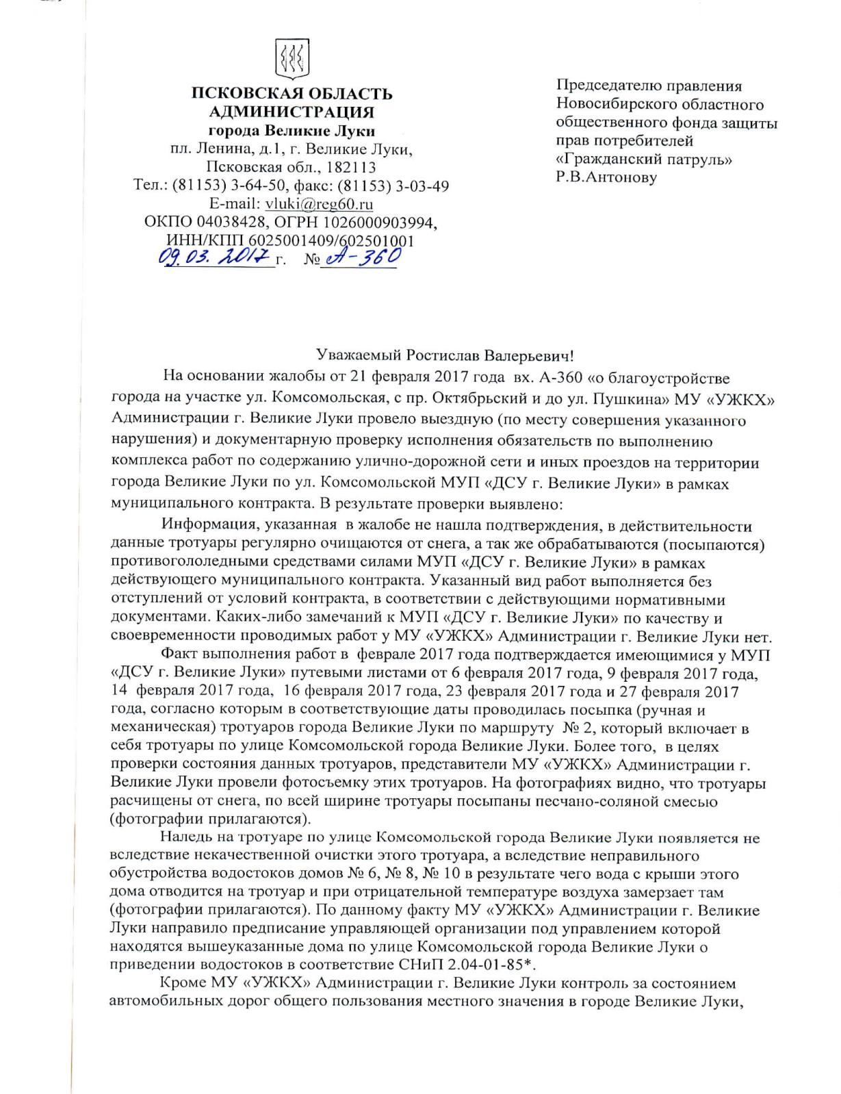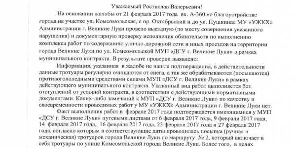 Номер жалобы:14598 Тип жалобы:Проблемы ЖКХ / дворы - Иные проблемы ЖКХ Название объекта: Город:Великие Луки, Комсомольская улица, 14 Описание жалобы:На участке ул. Комсомольская, с пр.Октябрьский и до ул.Пушкина( со стороны отделений мвд и фсб) не следят за тротуаром..Всю зиму-наледь,очень скольско..Люди обходят по газонной части и даже по дороге-проезжей части.