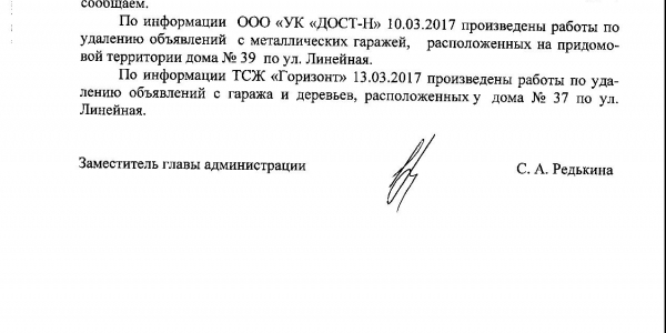 Номер жалобы:14579 Тип жалобы:Иные проблемы ЖКХ Название объекта:Управляющая Компания Город:Новосибирск Адрес:Новосибирск, улица Линейная, 39 Описание жалобы:Линейная 39, рядом с домом гаражи на которых много объявлений Статус: