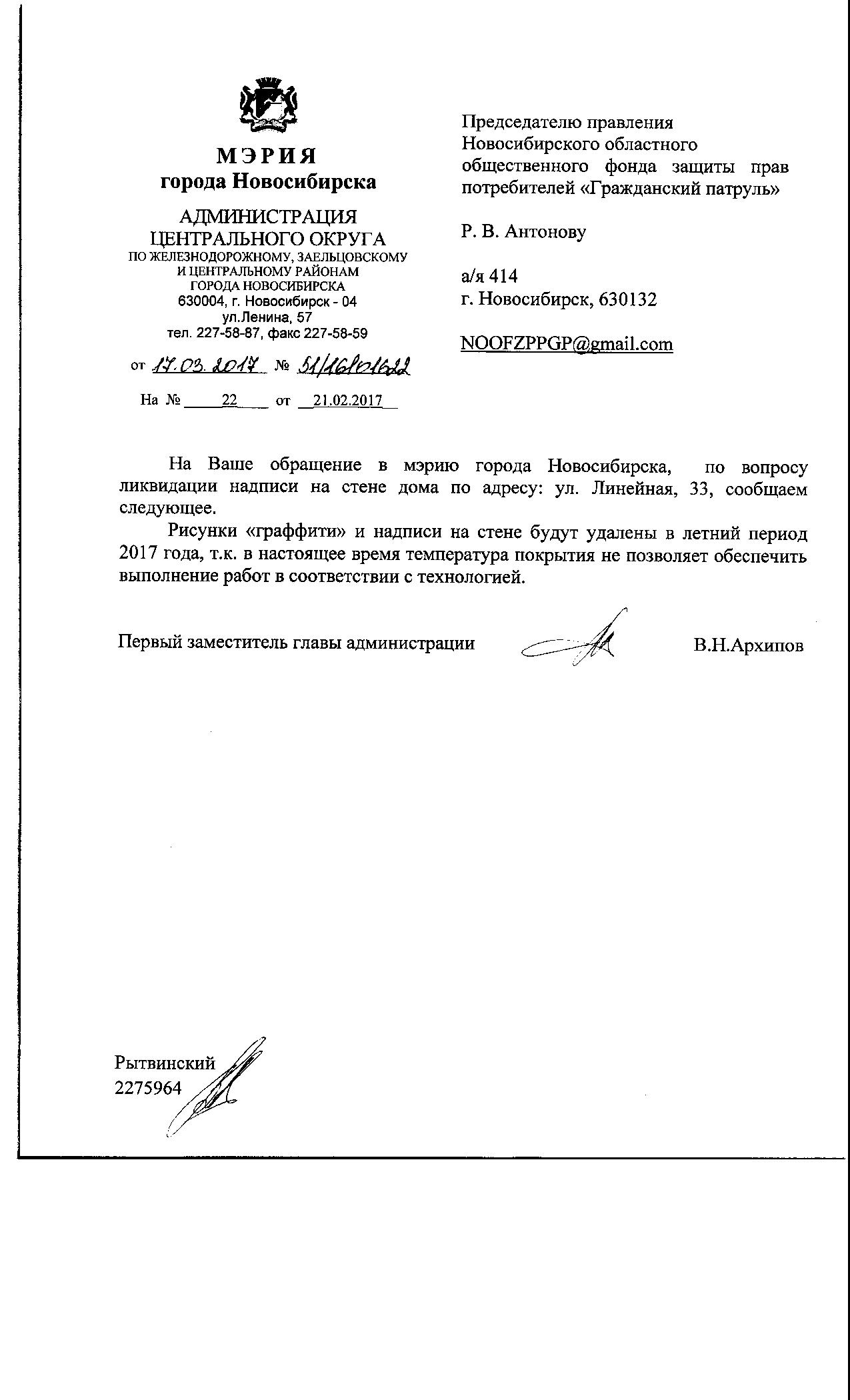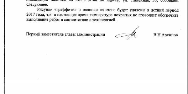 Номер жалобы:14567 Тип жалобы:Иные проблемы ЖКХ Название объекта:Управляющая Компания Город:Новосибирск Адрес:Новосибирск, улица Линейная, 33 Описание жалобы:Линейная 33,надписи на фасаде дома Статус: